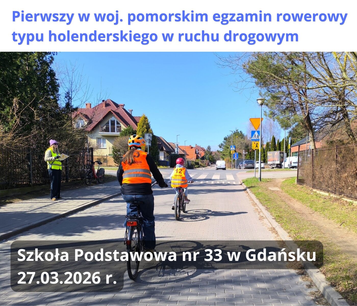 W piątek 27.03.2026 r. w Szkole Podstawowej nr 33 w Gdańsku Osowie (ZSO nr 2 w Gdańsku) odbył się pierwszy w woj. pomorskim egzamin rowerowy typu holenderskiego w ruchu drogowym. Udział wzięło w nim 19 uczniów i uczennic z klas V i VI posiadających kartę rowerową, którzy podczas indywidualnej jazdy po ulicach byli oceniani na 11 punktach kontrolnych. Egzamin przeprowadziliśmy wspólnie ze Stowarzyszeniem Rowerowa Gdynia, przy wsparciu ekipy z Zielonego Mazowsza, Rowerowego Białegostoku i wolontariuszy.