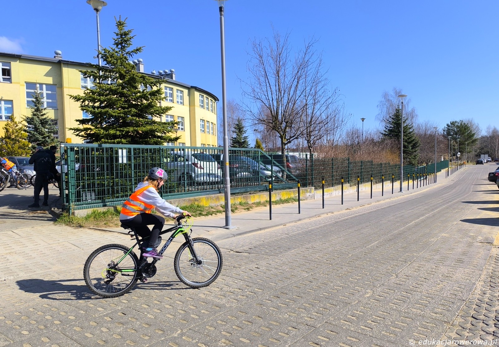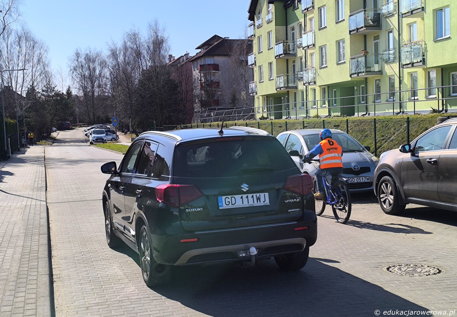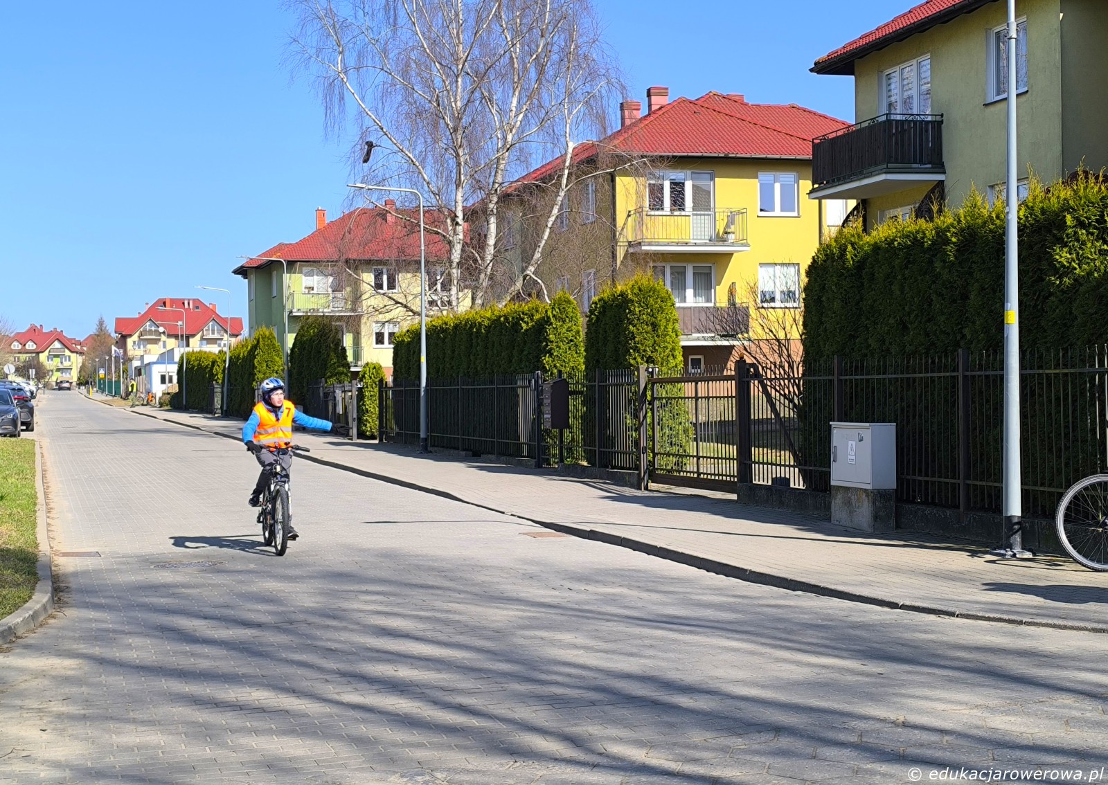 Po skręcie w prawo uczniowie jechali prostym odcinkiem drogi. Tu uczeń trzyma odstęp od parkujących samochodów, a jednocześnie jest wyprzedzany przez inny samochodów. Po to właśnie przed zbliżającym się skrętem w lewo, pierwszą czynnością będzie obejrzenie się za siebie.