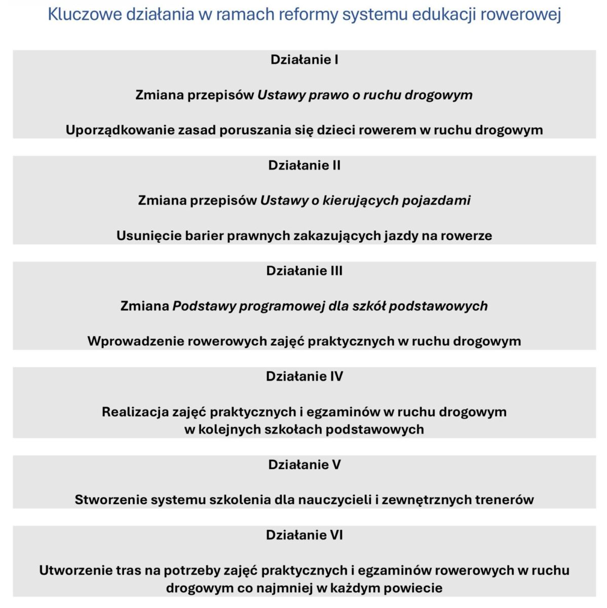 W części poświęconej proponowanym zmianom w systemie szkolenia rowerzystów, dotyczącym przede wszystkim dzieci od momentu nauczenia się jazdy na rowerze do ukończenia szkoły podstawowej (czyli w wieku do ok. 14 lat), wyszczególniliśmy sześć głównych działań, które w naszej ocenie są niezbędne, by w perspektywie 15-20 lat nowoczesna edukacja rowerowa stała się powszechna w całym kraju, a dzieci potrafiły bezpiecznie jeździć na rowerze mając duże umiejętności jazdy w prawdziwym ruchu drogowym, umieć oceniać sytuacje na drodze i unikać zagrożeń.