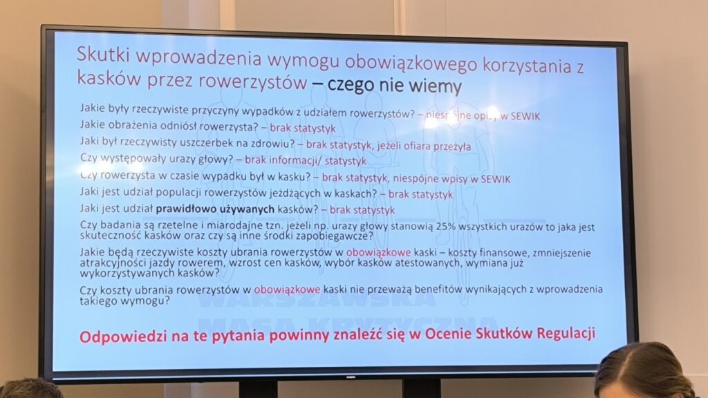 Wszystkie osoby obecne na sali zabrały głos, wypowiadając się zarówno za jak i przeciwko temu obowiązkowi. Nasze stanowisko wspólne z Federacją Rowerową, European Cyclists’ Federation i Fundacją Drogi Mazowsza jest niezmienne – kaski warto promować, ale nie poprzez obowiązek prawny. Padło również wiele pytań, na które nie ma odpowiedzi – można je przeczytać na jednym ze slajdów.