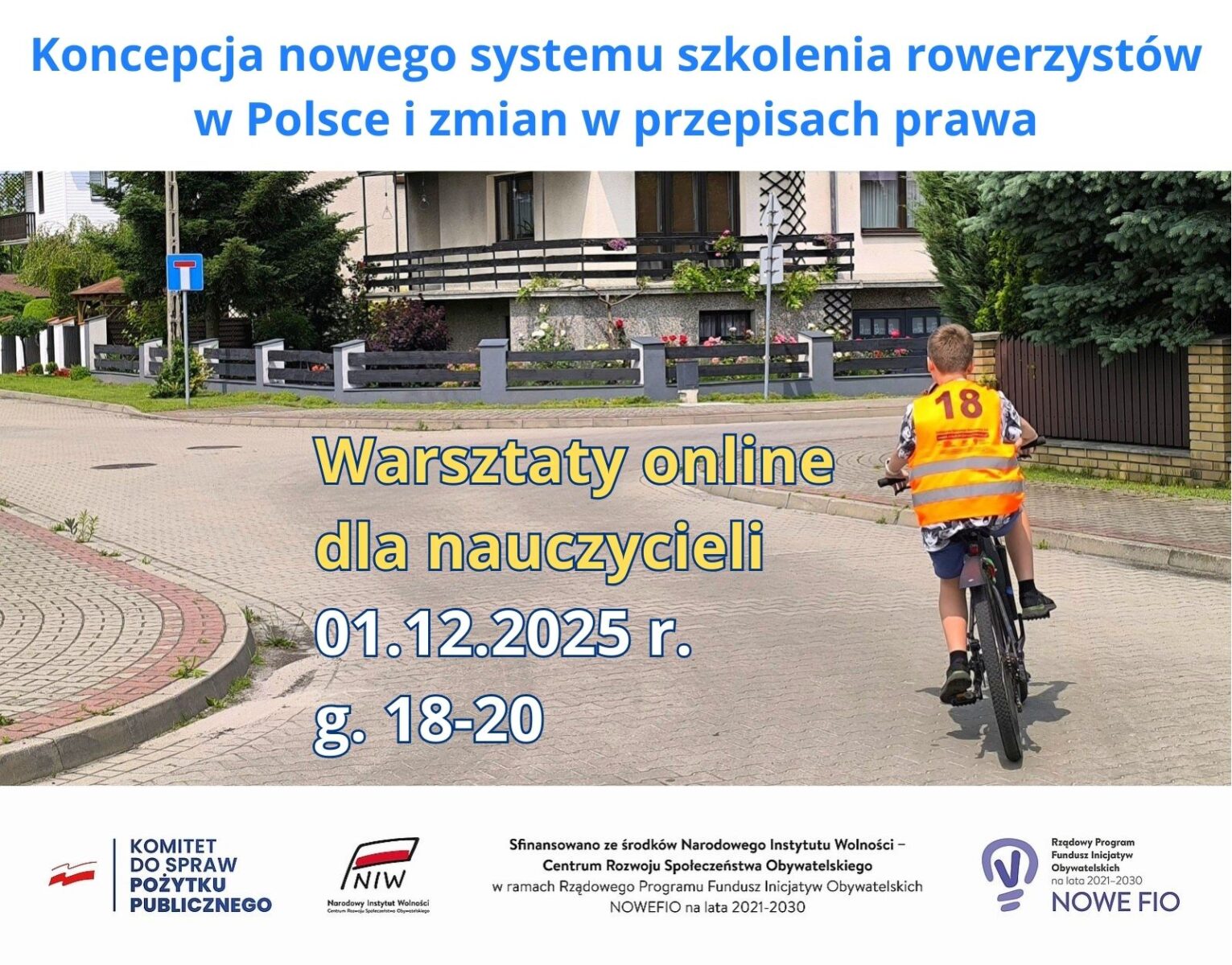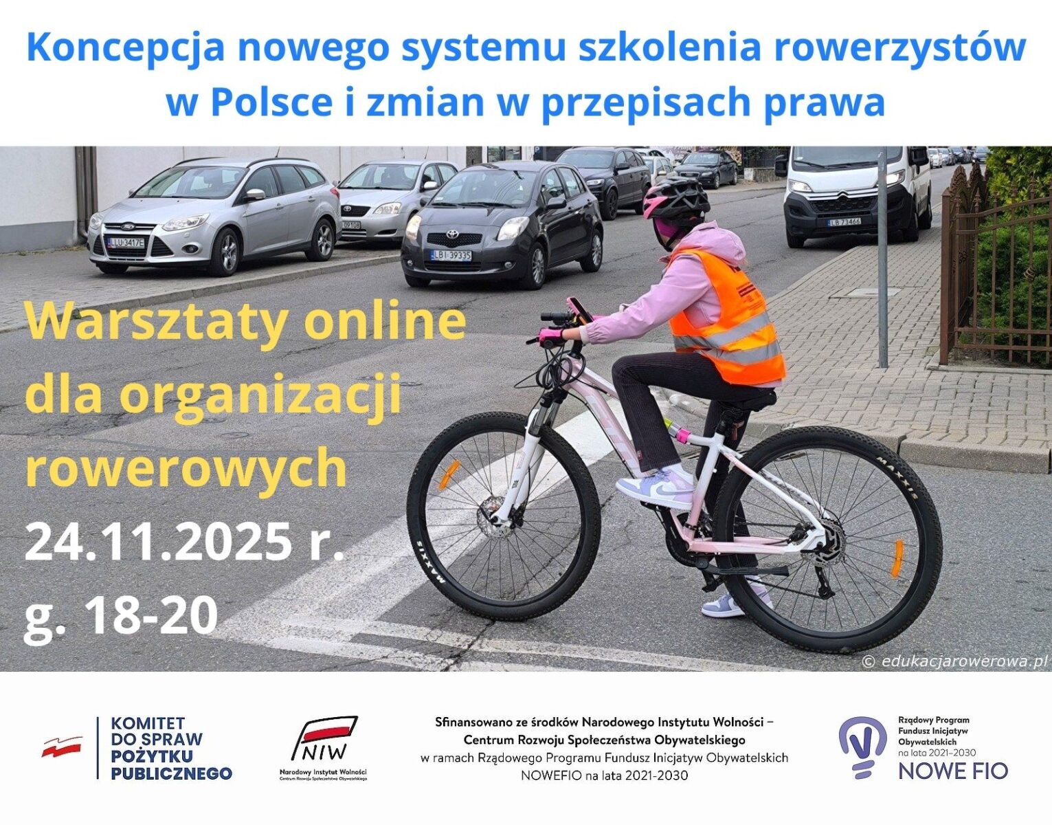 Już w dwa najbliższe kolejne poniedziałki 24.11 i 01.12 zapraszamy osoby zaangażowane w organizacjach i grupach rowerowych a także nauczycieli wychowania komunikacyjnego na 2h warsztaty online poświęcone stworzeniu dokumentu „Koncepcji nowego systemu szkolenia rowerzystów w Polsce i zmian w przepisach prawa”.