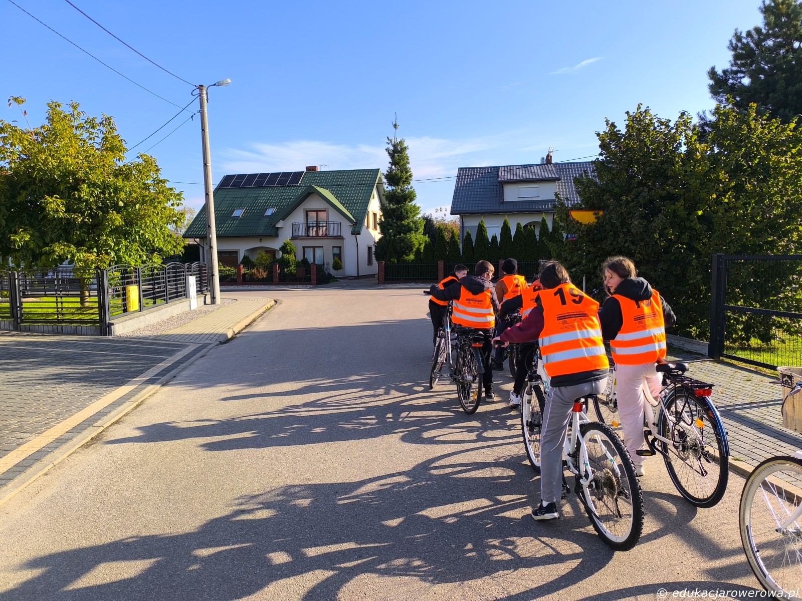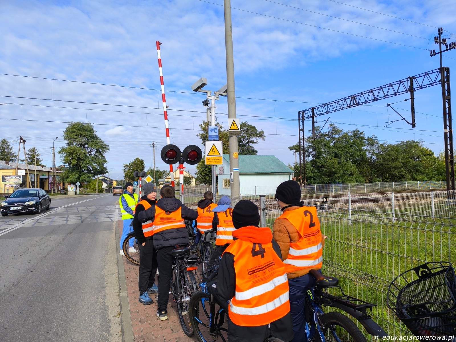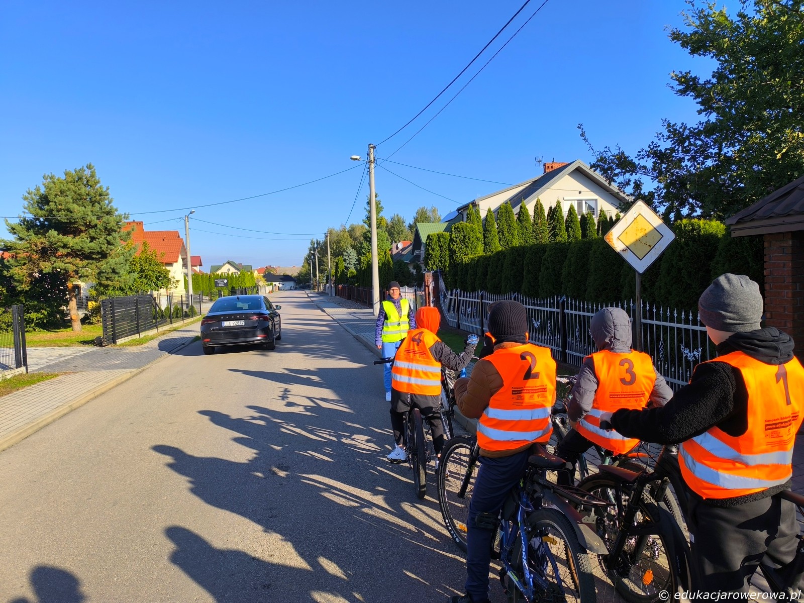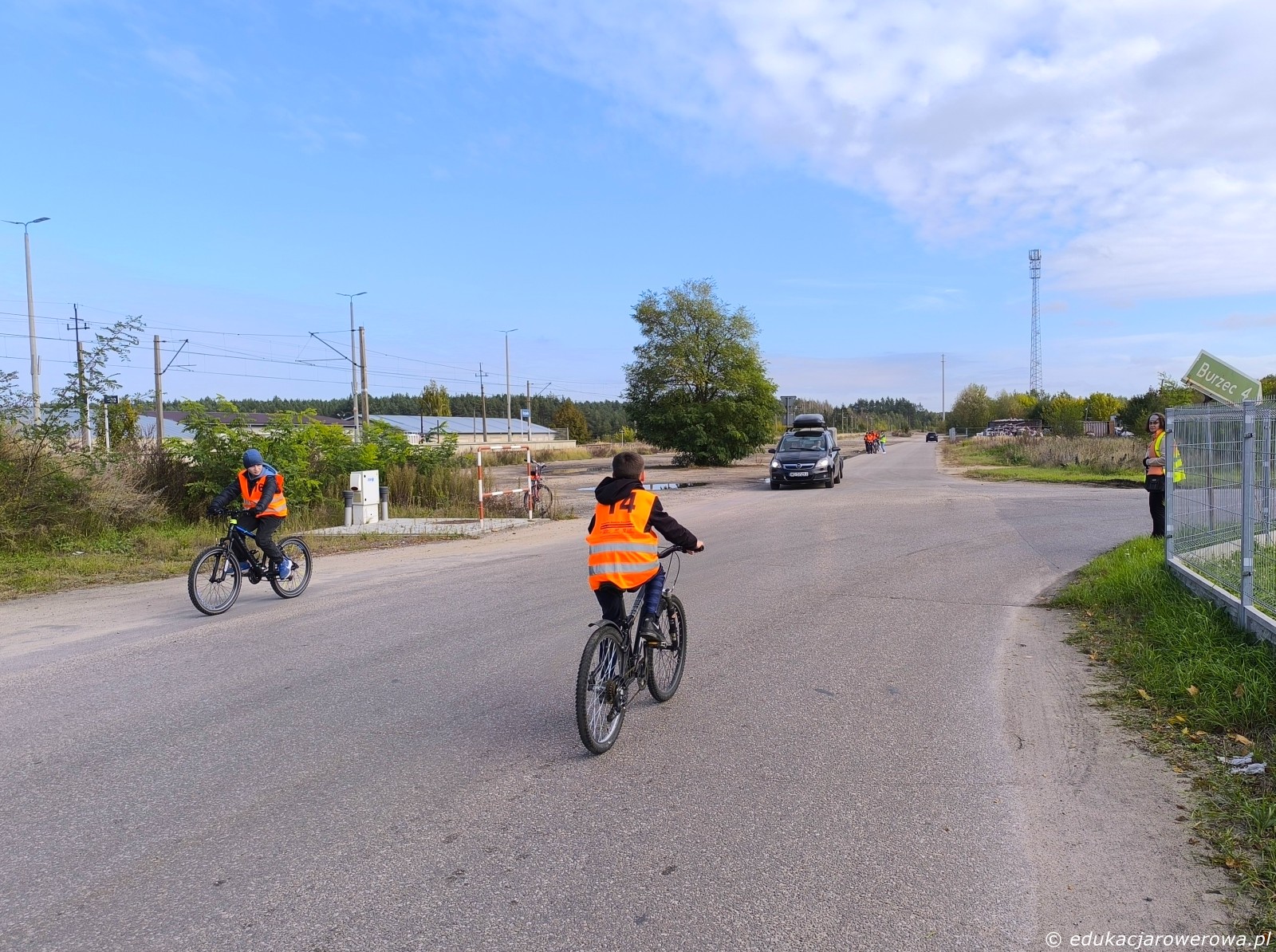Brak tu oznakowania poziomego wlotu podporządkowanego, więc uczniowie muszą nauczyć się, w którym miejscu trzeba się zatrzymać. Zwraca uwagę także poprawne ułożenie korb i nóg do efektywnego ruszania.