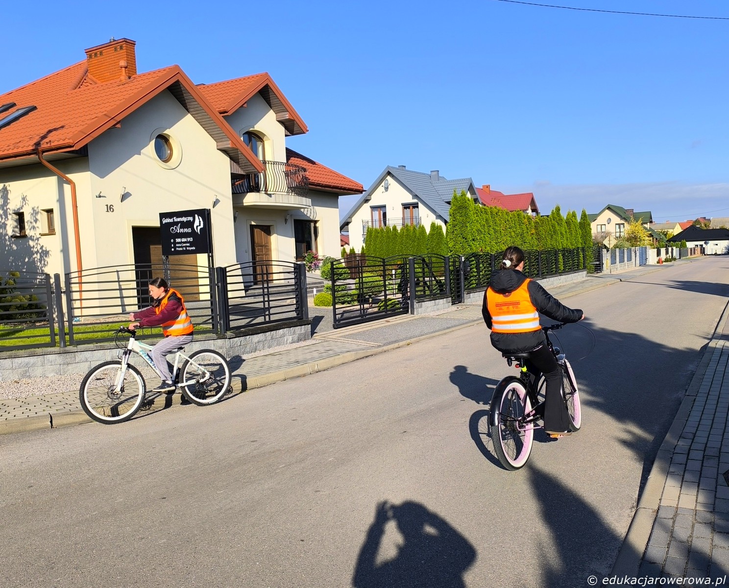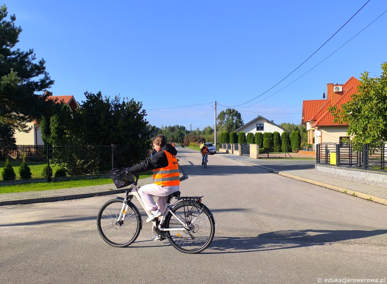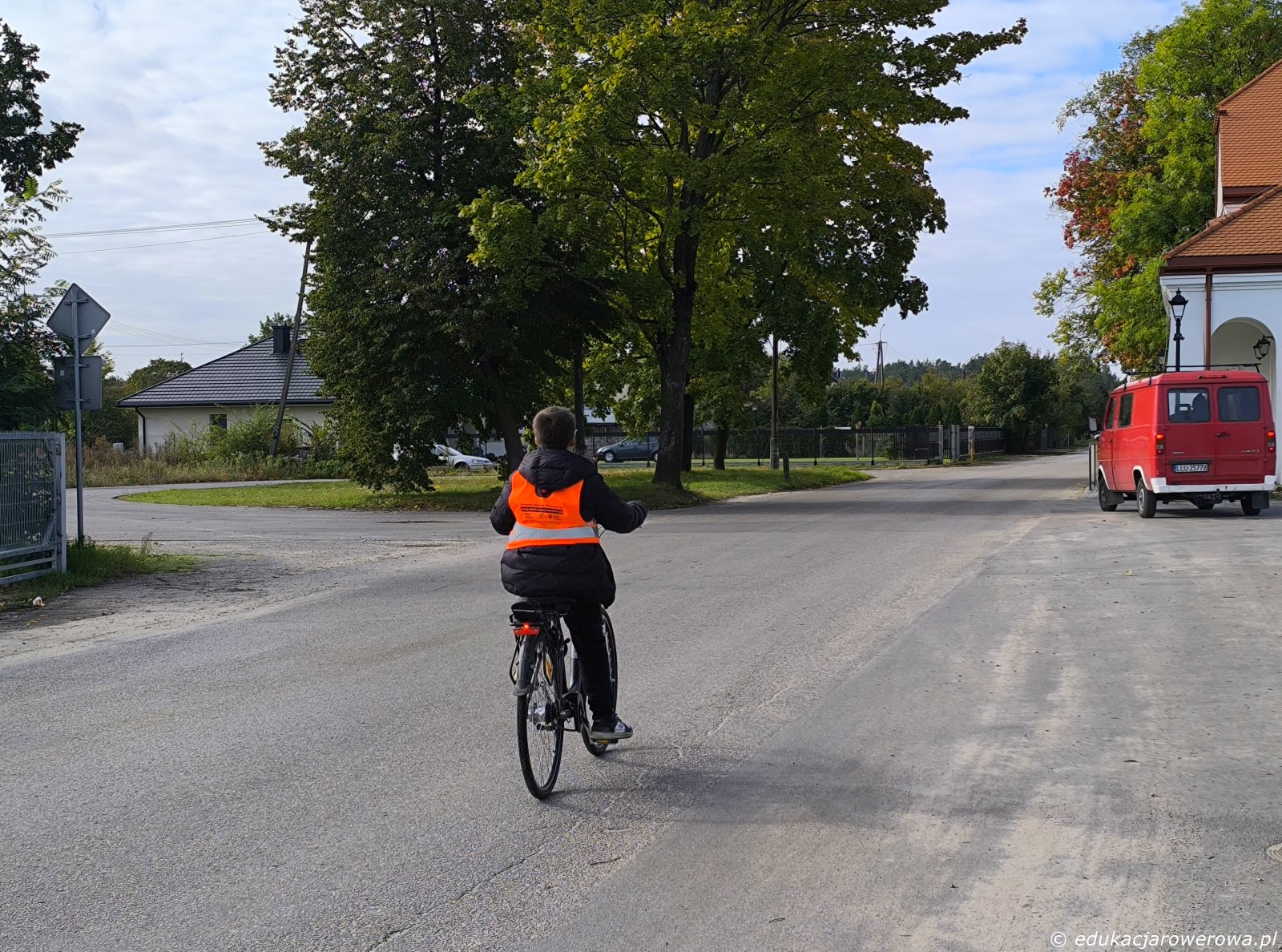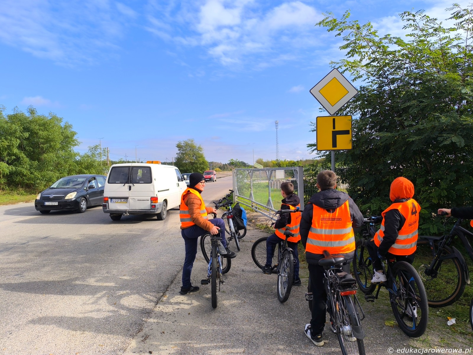 Tu uczeń na pierwszym planie jedzie blisko środka jezdni na drodze z pierwszeństwem – takie zachowanie ma uzasadnienie, gdyż uniemożliwia zajechanie drogi przez pojazdy skręcające w prawo które poruszają się drogą z pierwszeństwem.