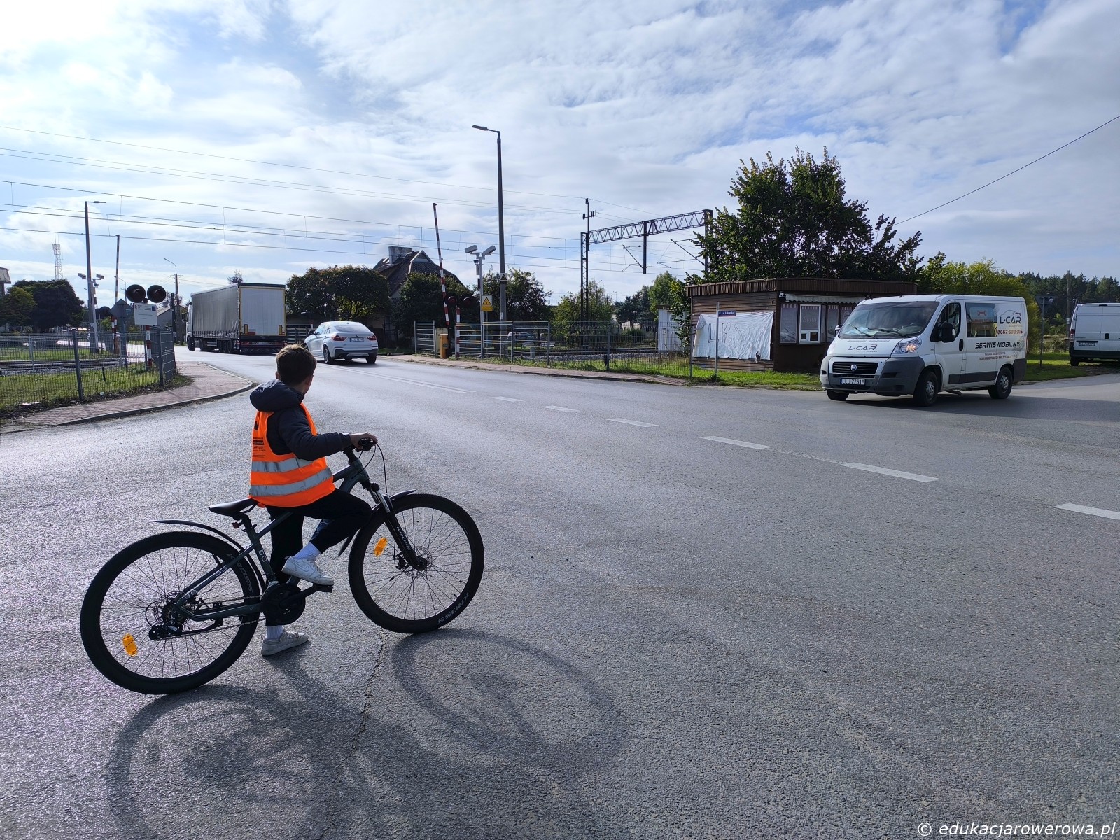 Przejeżdżamy tory kolejowe i za budynkiem stacji omawiamy zasady na pierwszeństwie łamanym.