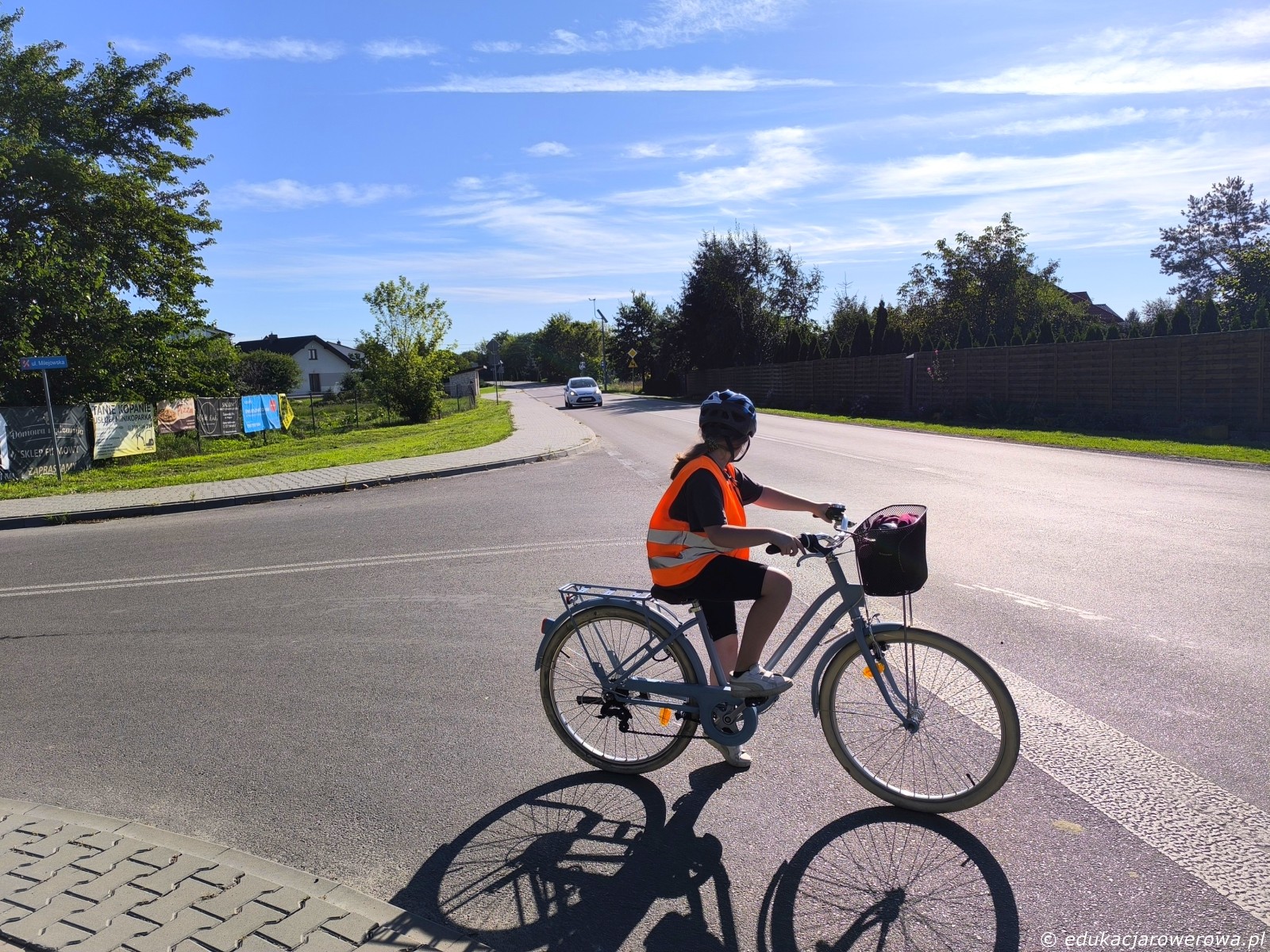 Tymczasem przed uczniami następne ćwiczenie – skręt w prawo z drogi podporządkowanej ze znakiem STOP. Uczennica dojechała do linii zatrzymania, przyjęła odpowiednią pozycję do jazdy (ułożenie korb) i obserwuje nadjeżdżający pojazd któremu musi ustąpić pierwszeństwa.
