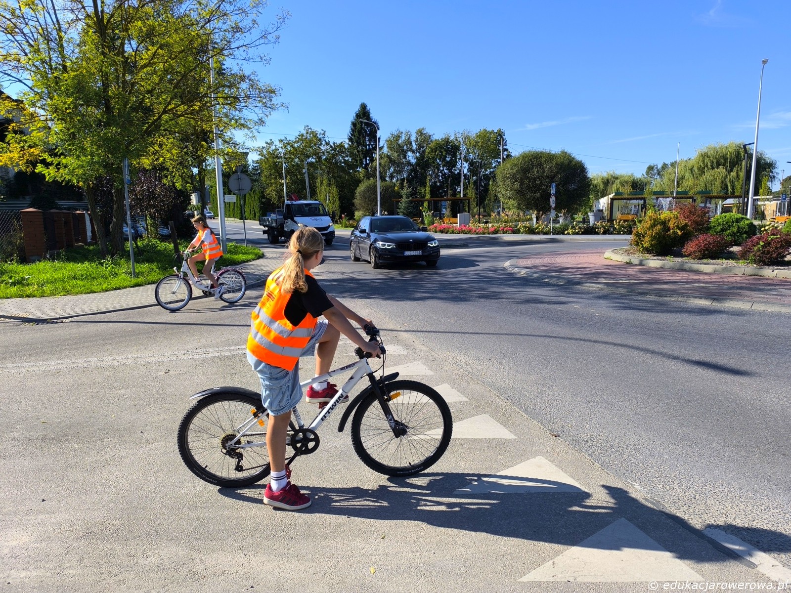 Tu jedna uczennica zjechała z ronda, a druga czeka na wjazd.