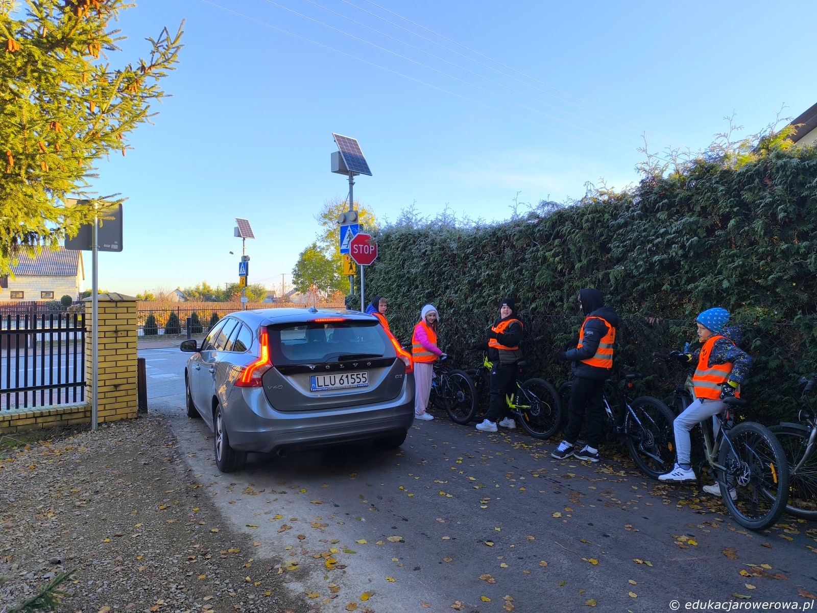 Po szybkim wstępie docieramy do drogi wyjazdowej ze szkoły. Znak STOP, gęsta zieleń i rozmowa o tym gdzie należy się zatrzymać przed drogą poprzeczną. A także, dlaczego należy pamiętać o pieszych na chodniku. Jedna z uczennic dodała także, że niedawno o mało co nie miała tu kolizji z szybko jadącą osobą na e-hulajnodze.