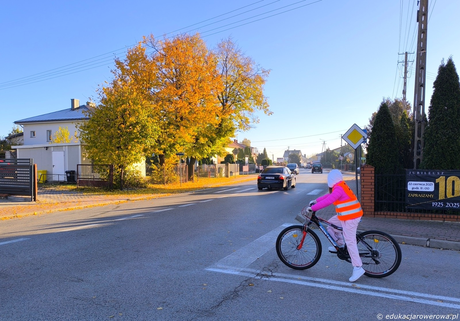 Ponieważ droga podporządkowana stanowi przedłużenie drogi z pierwszeństwem z tego kierunku ruchu, dla bezpieczeństwa należy zjechać na środek pasa ruchu, tak by ewentualny kierowca jadący z tyłu nie miał wątpliwości, że rowerzystka będzie skręcać.