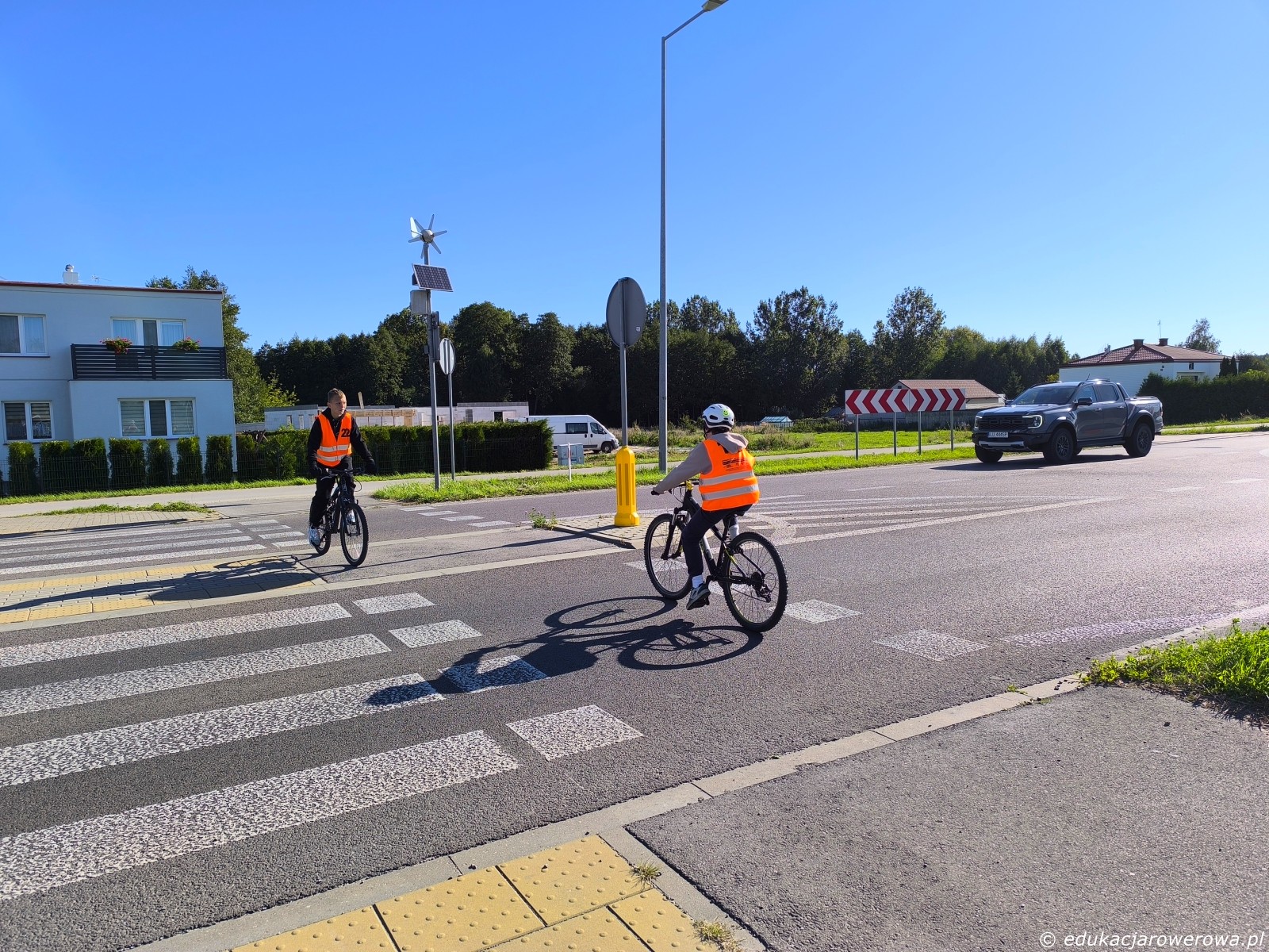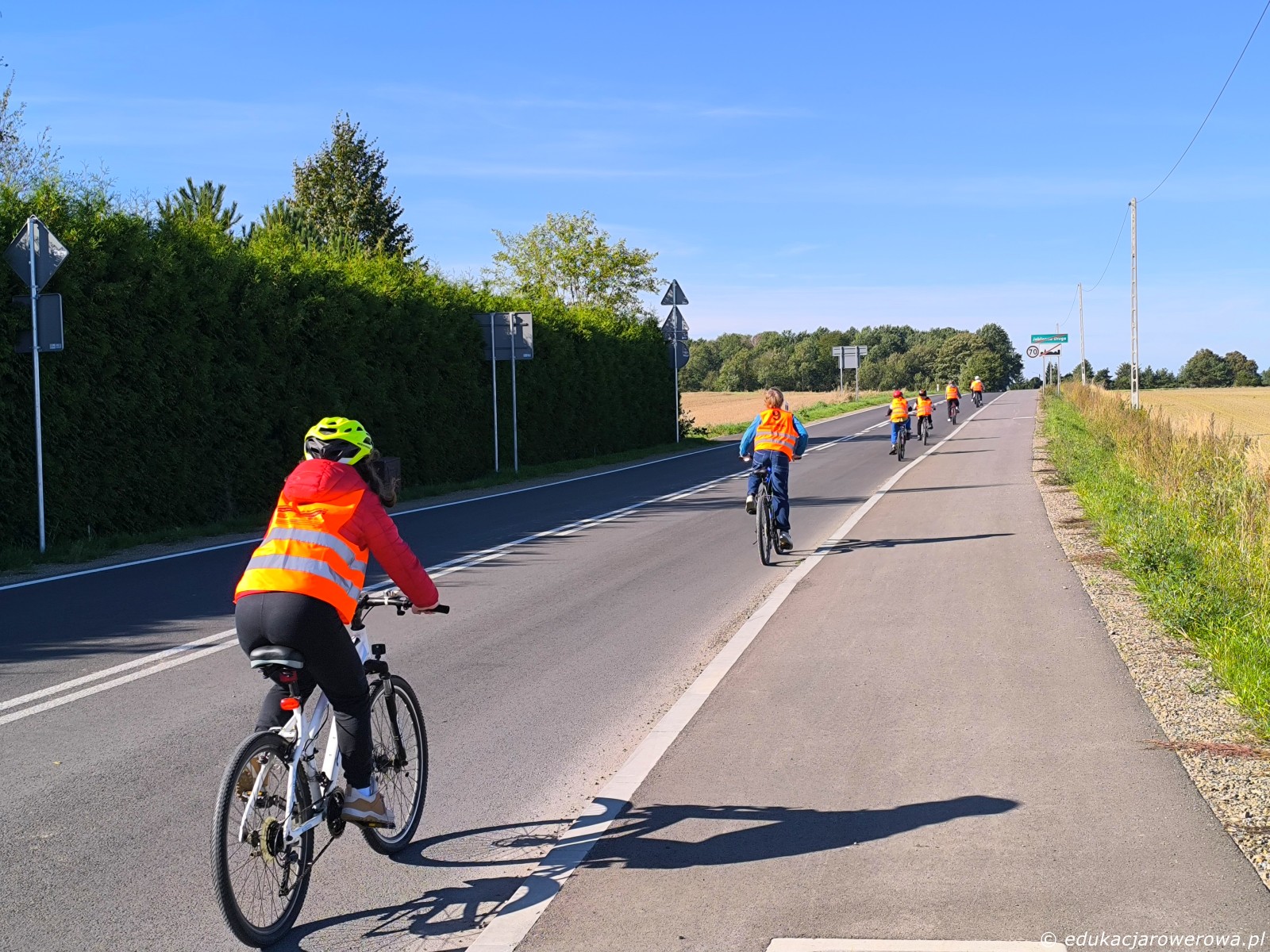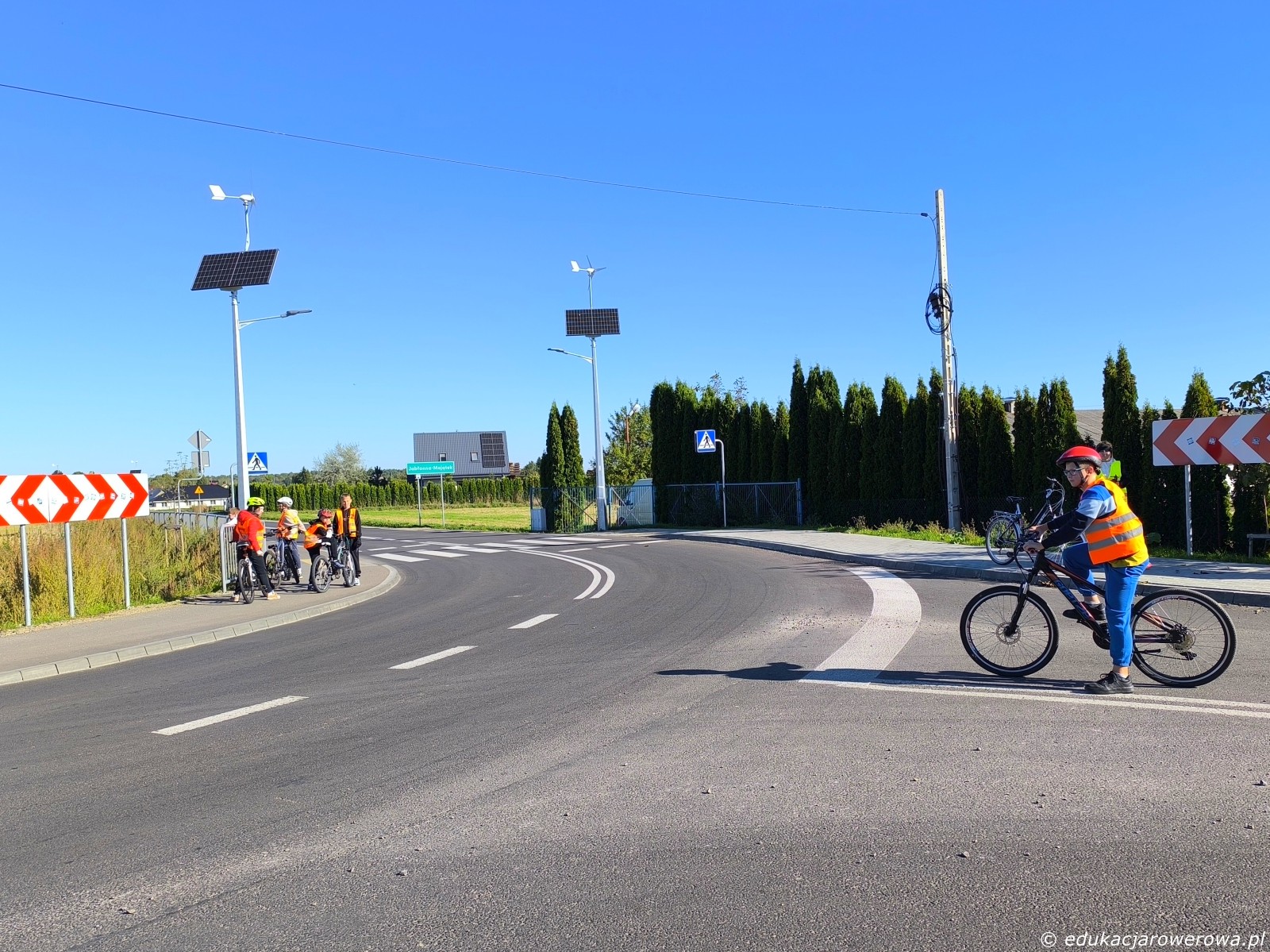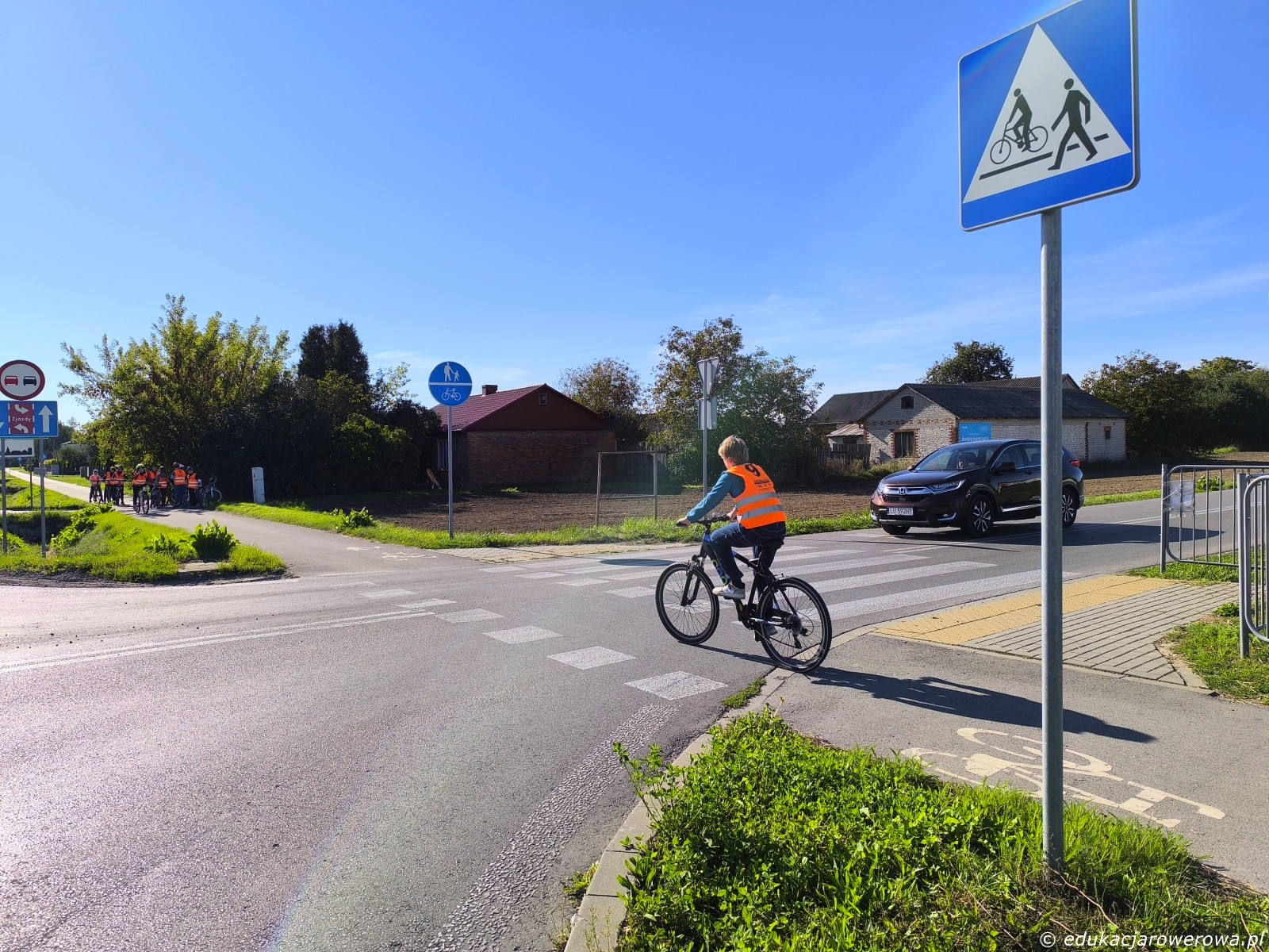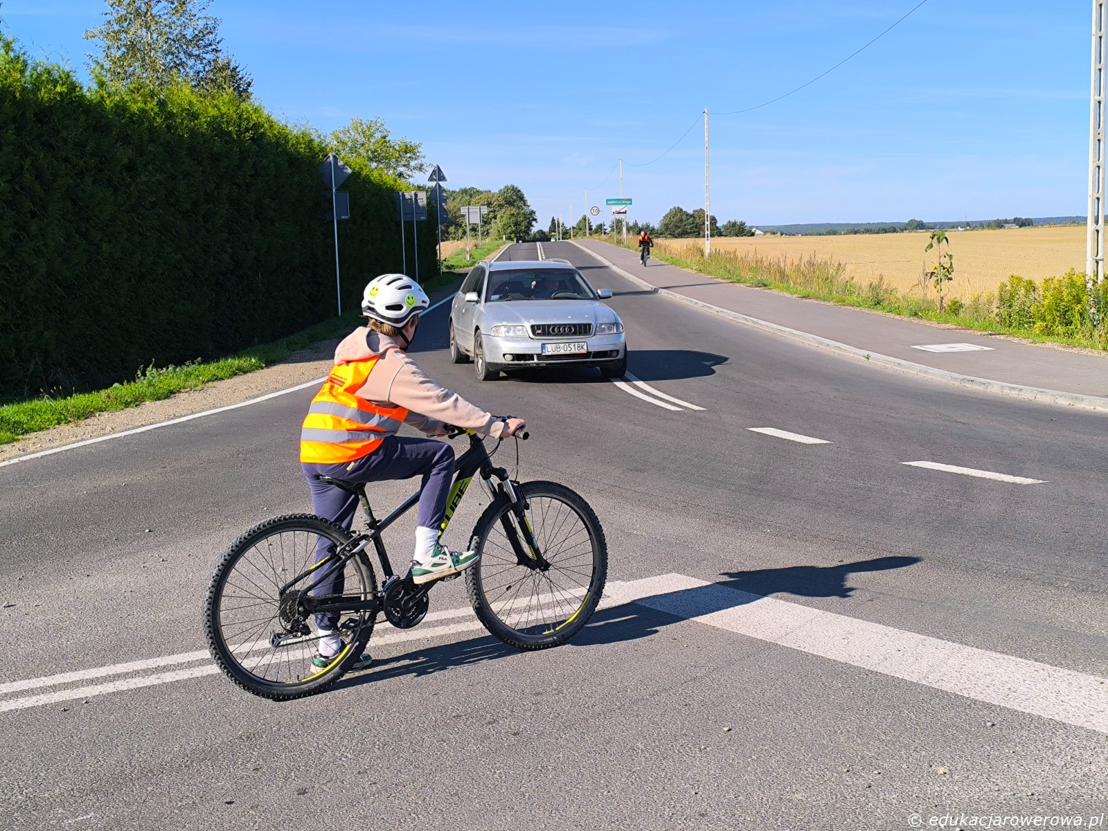 Jesteśmy w Jabłonnej, gdzie korzystamy z wygodnych asfaltowych dróg dla pieszych i rowerów wzdłuż DW835. Tu uczniowie w ramach ćwiczenia ciągłego mieli łącznie przejechać 6x po przejeździe dla rowerów. A przed wjechaniem rozejrzeć się i upewnić że można to zrobić bezpiecznie.