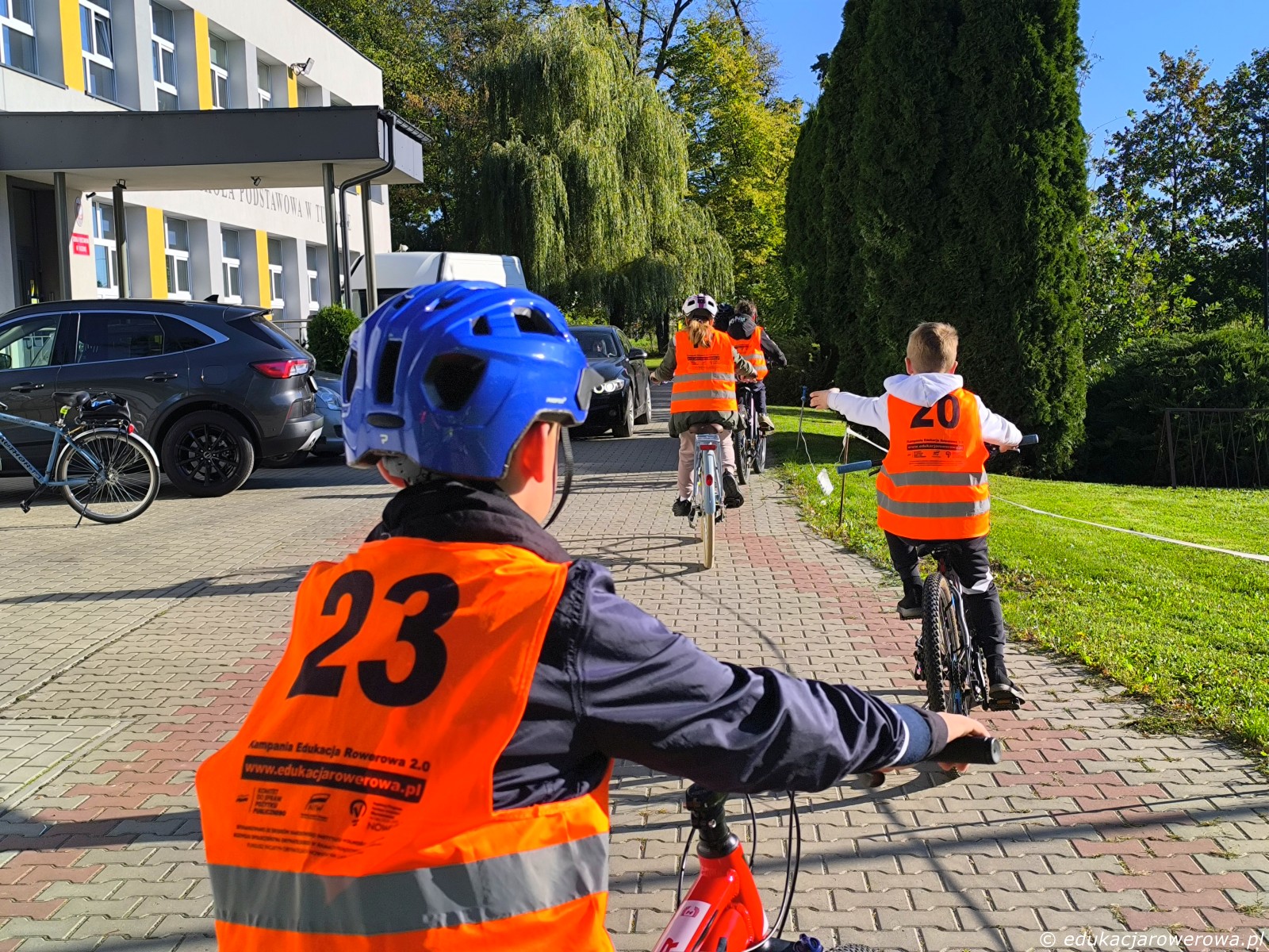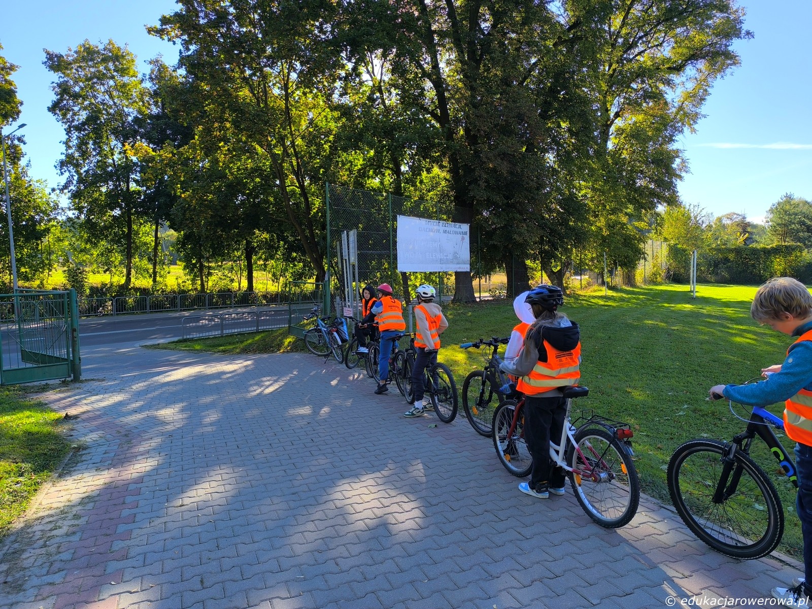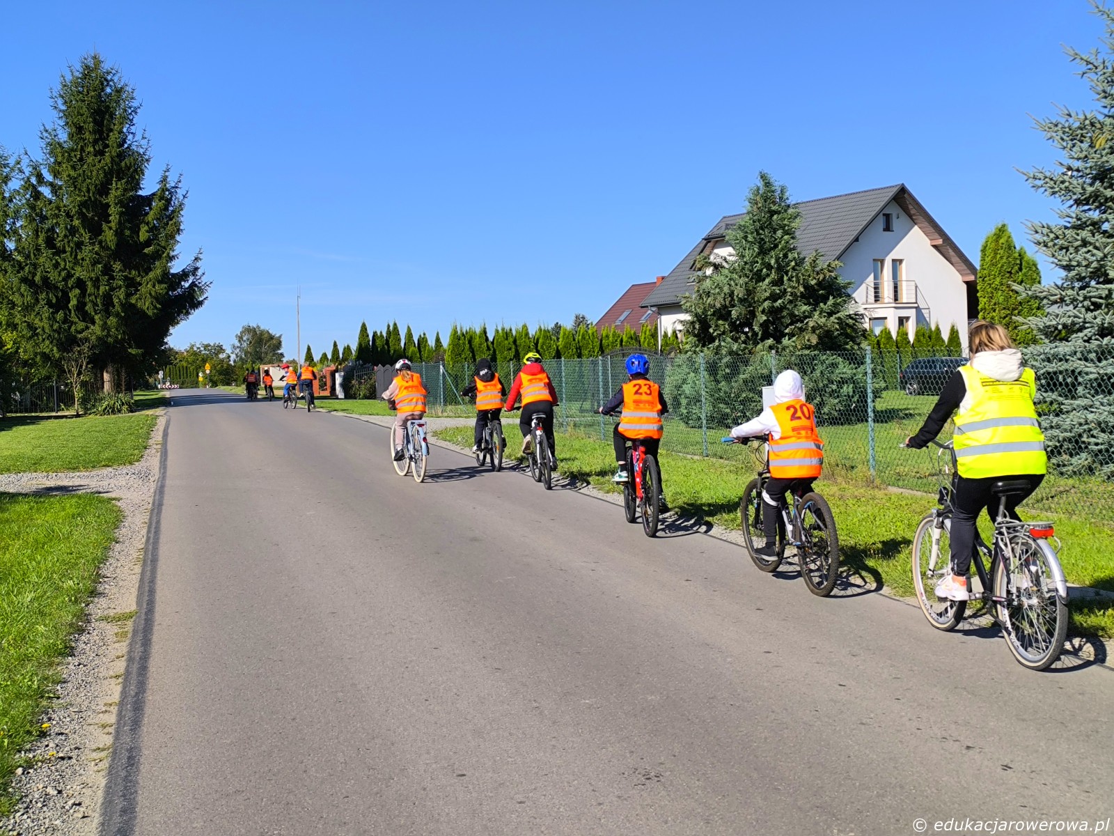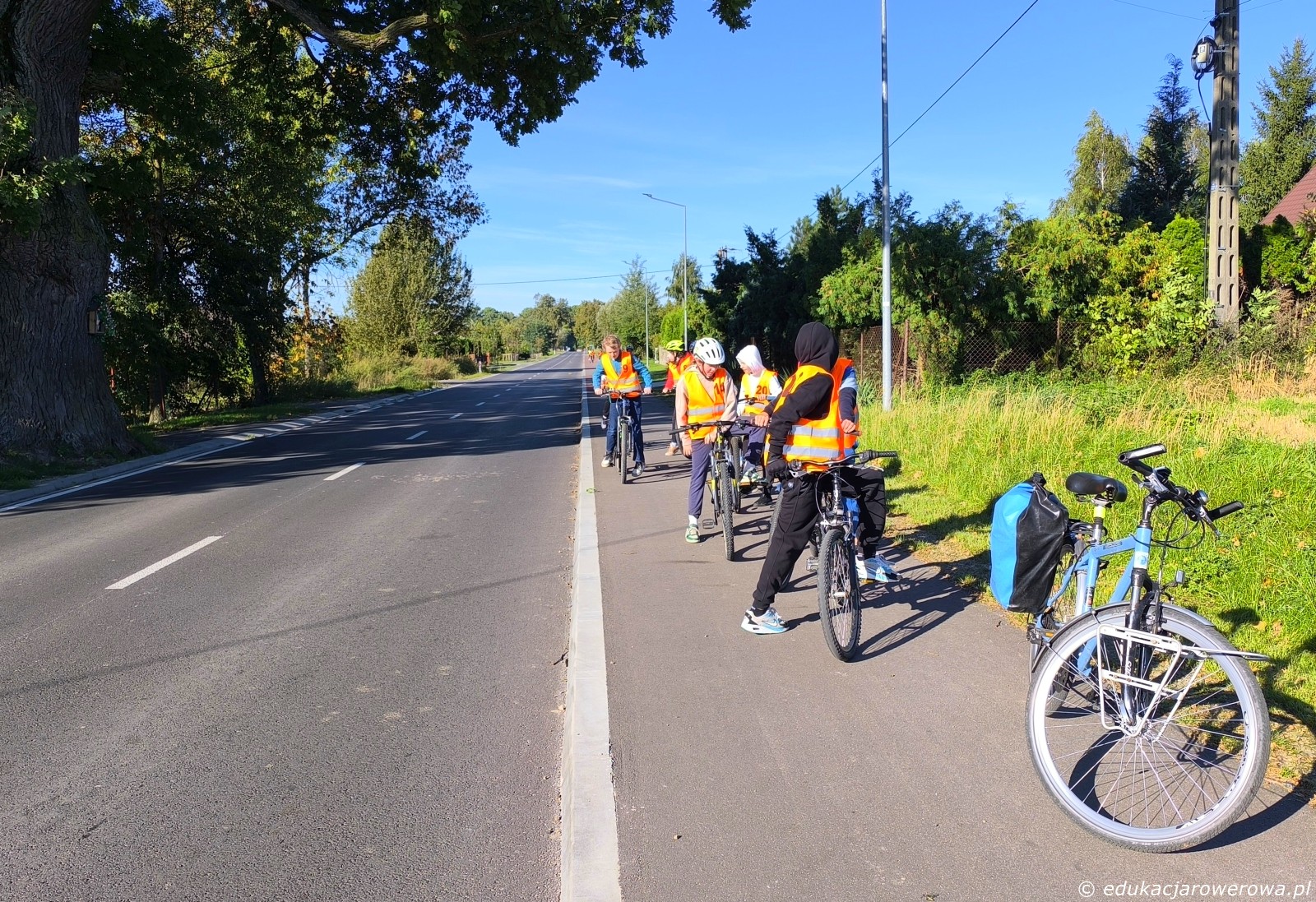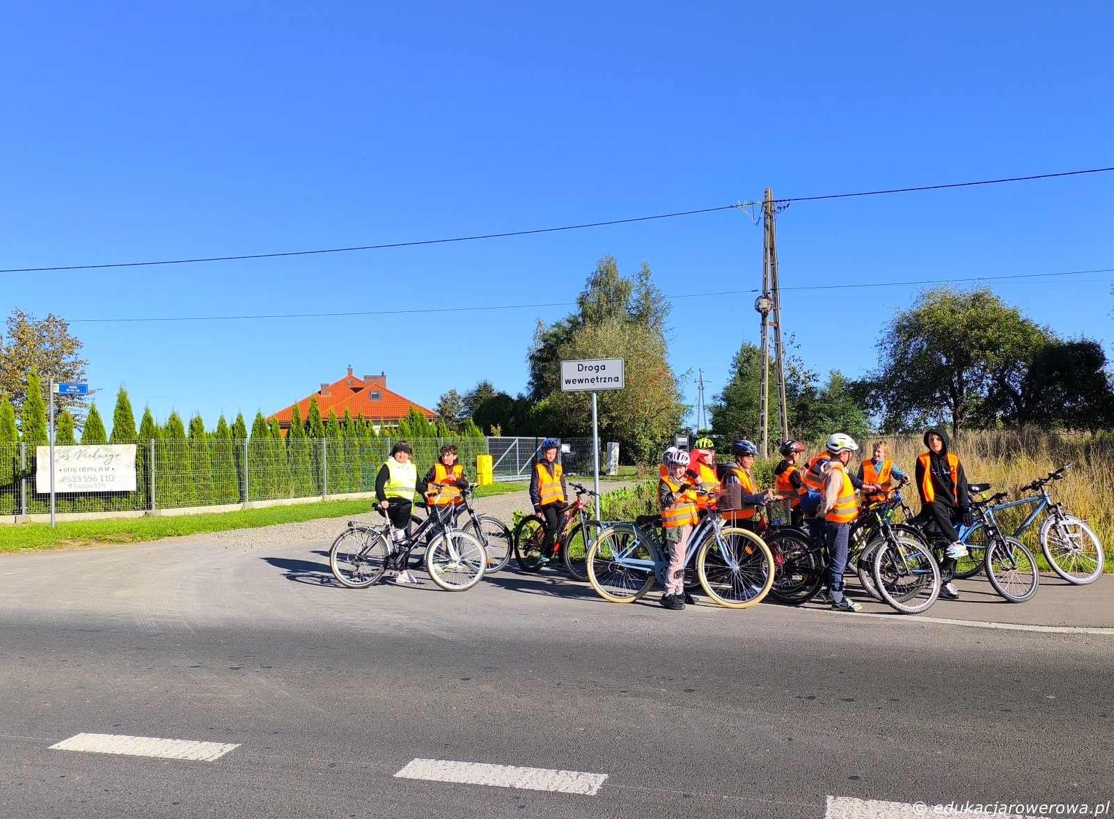Jesteśmy w Jabłonnej, gdzie korzystamy z wygodnych asfaltowych dróg dla pieszych i rowerów wzdłuż DW835. Tu uczniowie w ramach ćwiczenia ciągłego mieli łącznie przejechać 6x po przejeździe dla rowerów. A przed wjechaniem rozejrzeć się i upewnić że można to zrobić bezpiecznie.