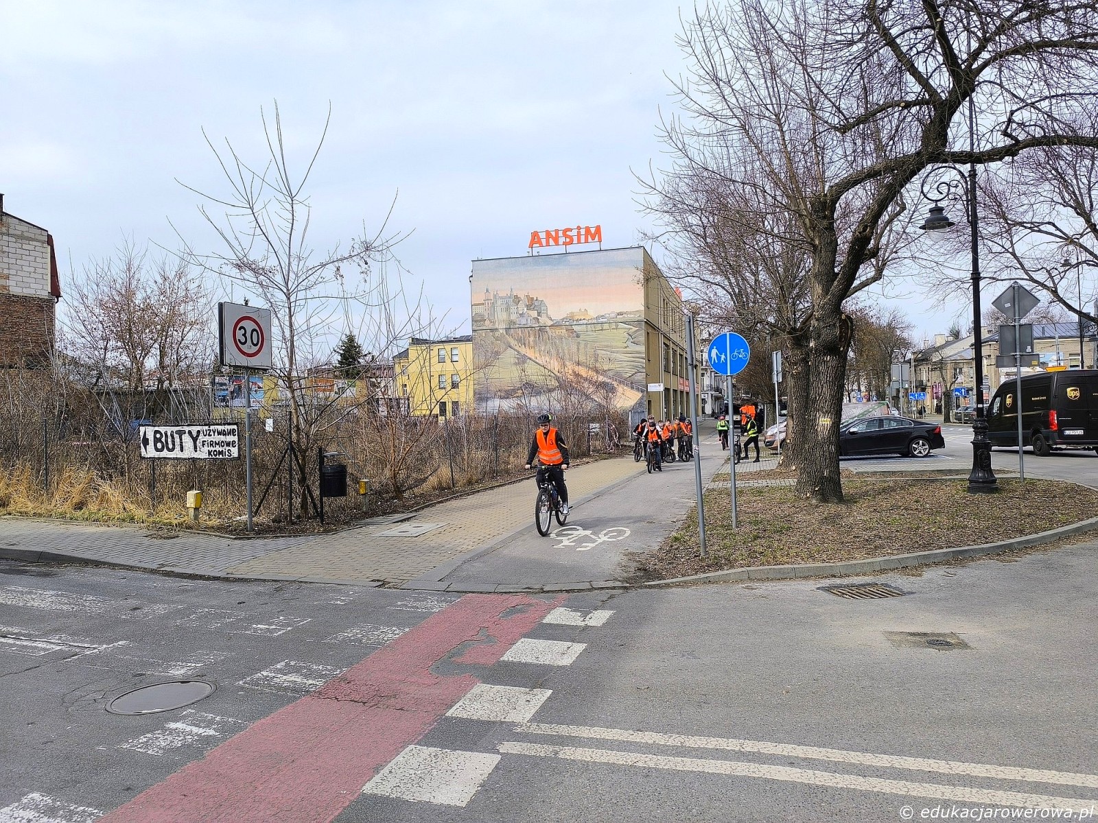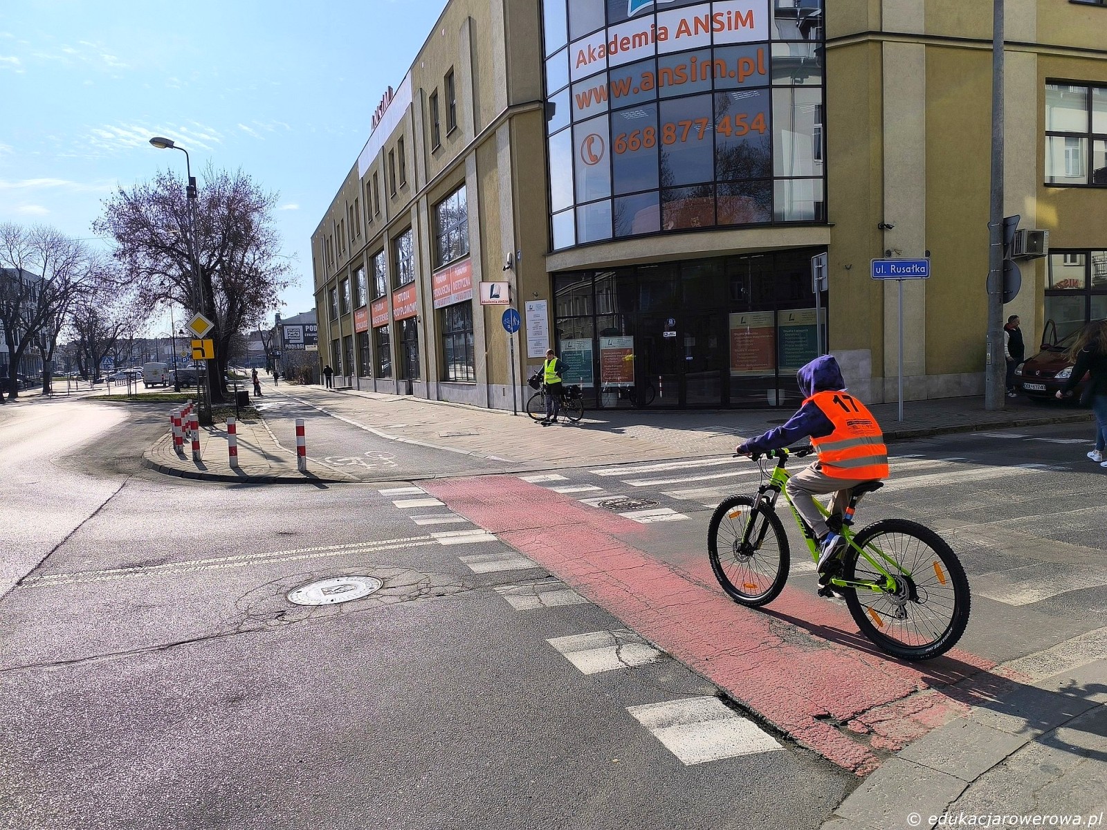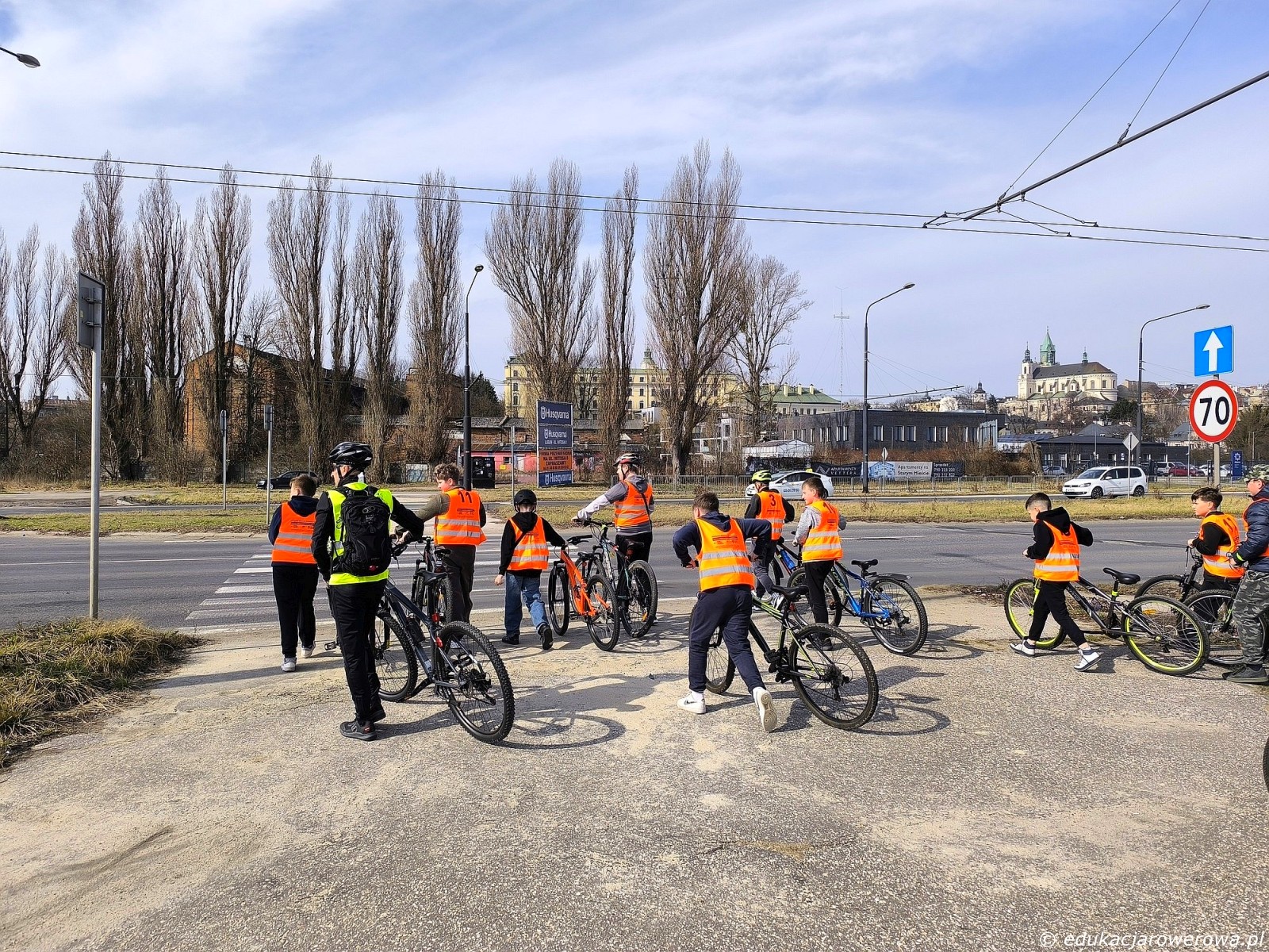 Na skrzyżowaniu ul. Zamojskiej i ul. Rusałki przeprowadzamy ćwiczenia indywidualne na przejeździe dla rowerów. To jedno z mniej bezpiecznych tego typu miejsc w Lublinie – duży ruch i ograniczona widoczność boczna przez sąsiadujące kamienice. Podkreślamy znaczenie obserwacji drogi i kierunków skąd mogą nadjechać pojazdy