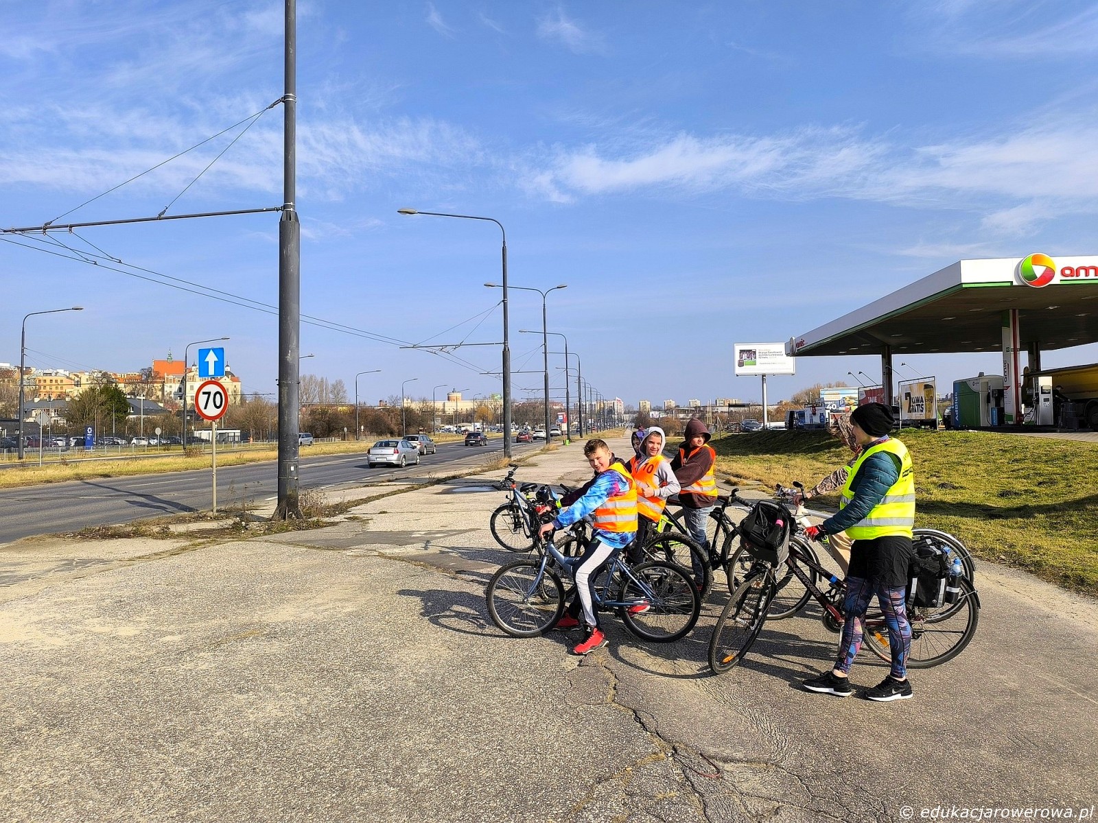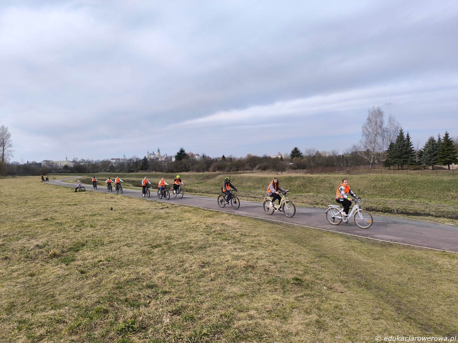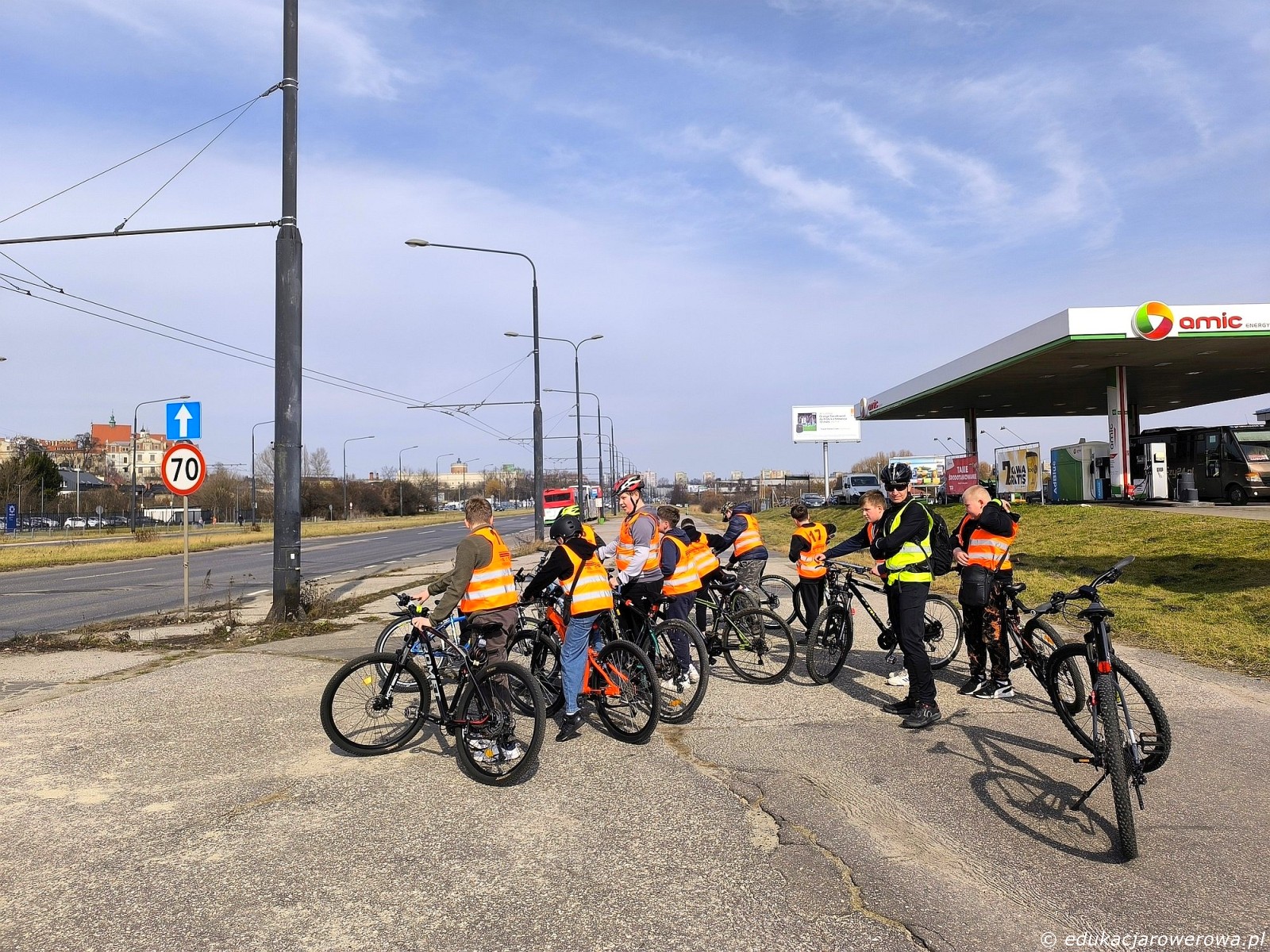 Na skrzyżowaniu ul. Zamojskiej i ul. Rusałki przeprowadzamy ćwiczenia indywidualne na przejeździe dla rowerów. To jedno z mniej bezpiecznych tego typu miejsc w Lublinie – duży ruch i ograniczona widoczność boczna przez sąsiadujące kamienice. Podkreślamy znaczenie obserwacji drogi i kierunków skąd mogą nadjechać pojazdy