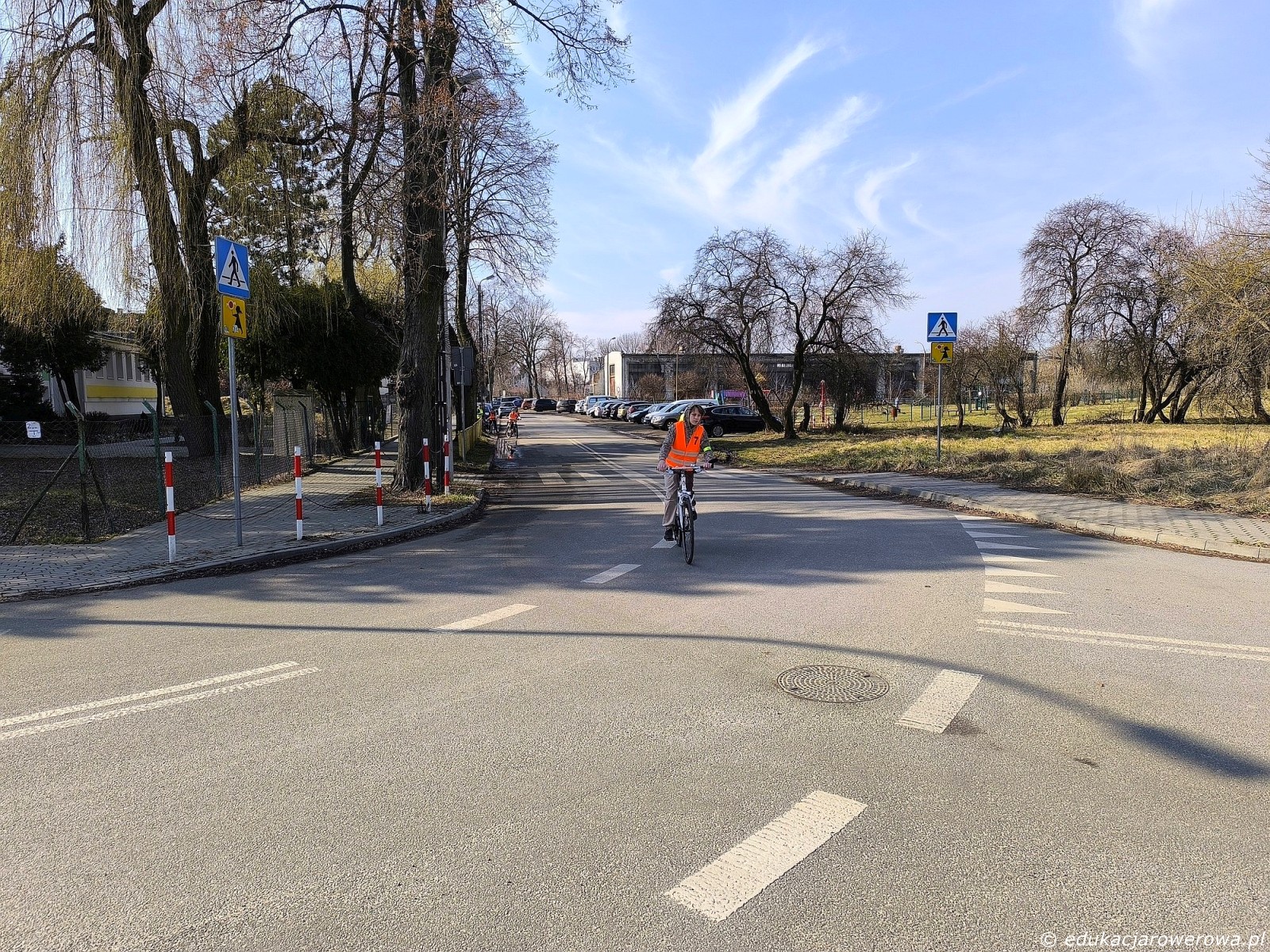 Kolejny z potencjalnie kolizyjnych przejazdów dla rowerów i ćwiczenie indywidualne z ćwiczeniem karku, czyli obserwacją otoczenia i kierunków skąd mogą nadjechać pojazdy.