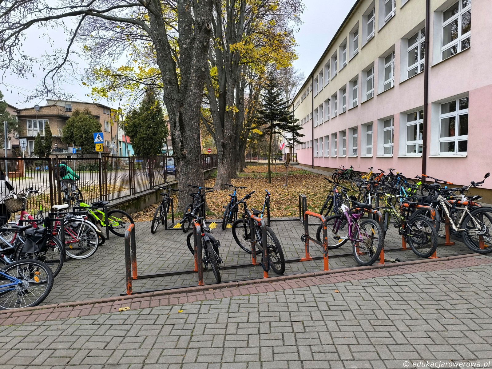 Część uczniów była już po lekcjach, ale i tak ruch rowerowy w SP4 ma się dobrze. Widoczne stojaki U-kształtne zostały zakupione wiele lat temu.
