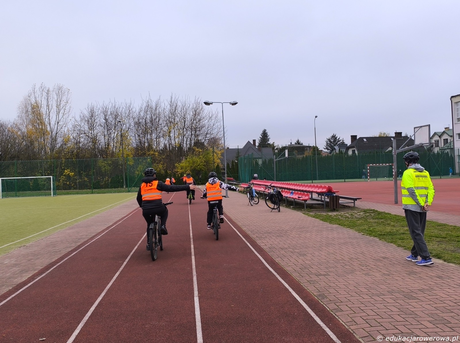 Na początek ćwiczenia na boisku: ustawienie korb, sygnalizacja manewrów, obracanie głowy i hamowanie.