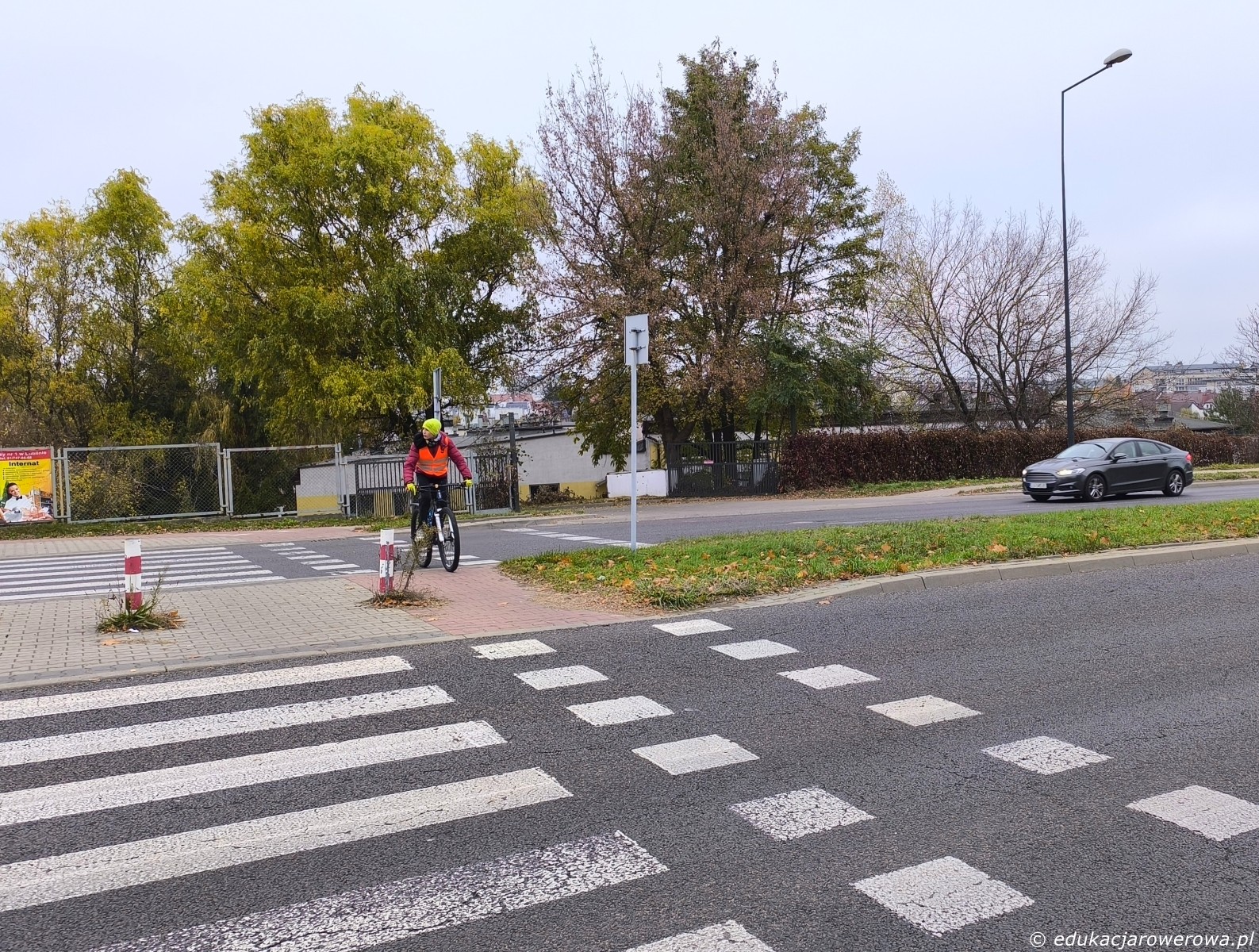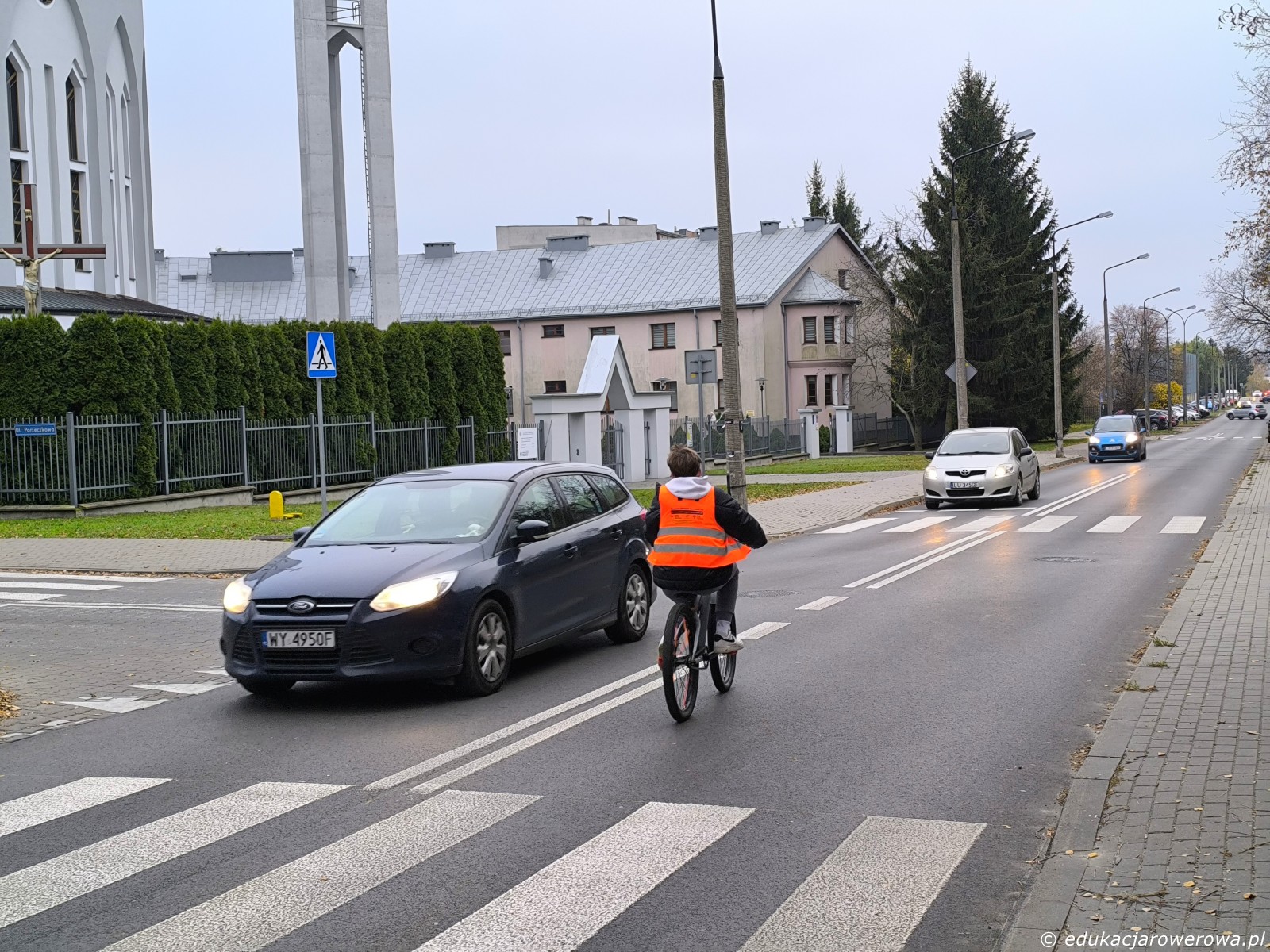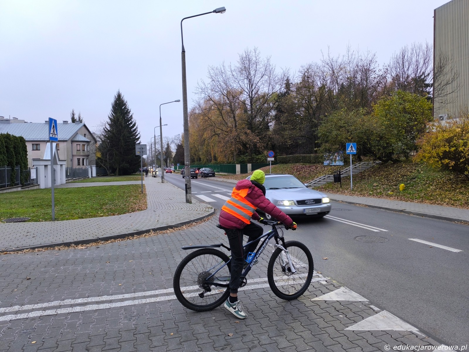I jeszcze jedno ćwiczenie – przejazdy dla rowerów przez drogę 2×2, zachowanie ostrożności i uwaga na samochody na drugim pasie ruchu.