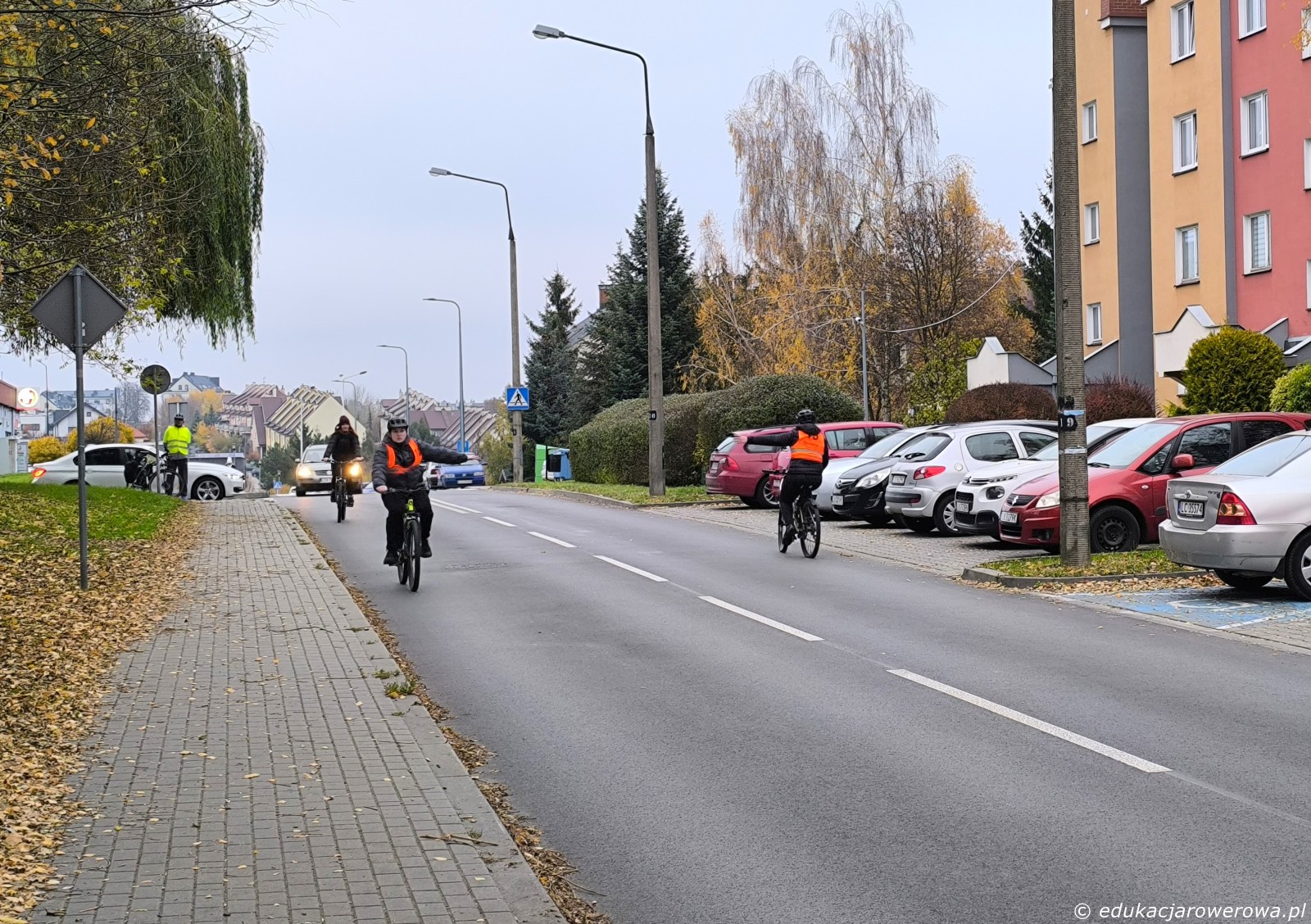 W tle dwóch uczniów sygnalizuje zamiar skrętu w lewo, po czym dojedzie do osi jezdni.