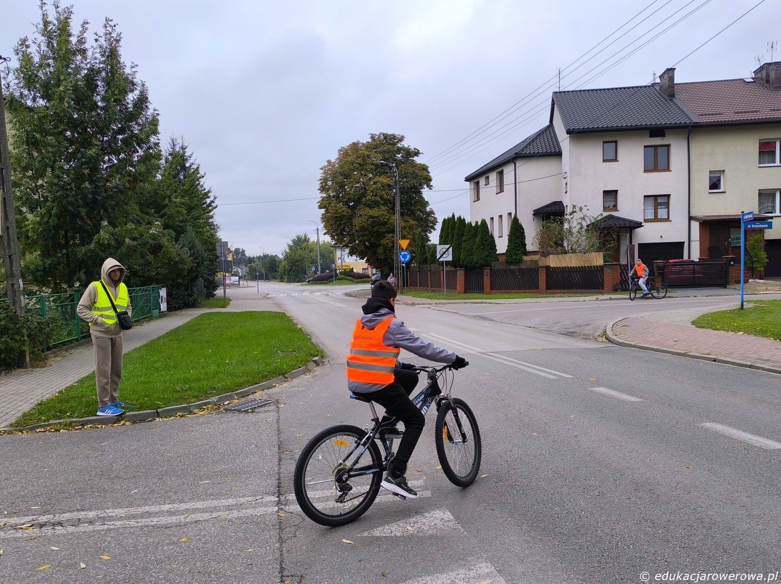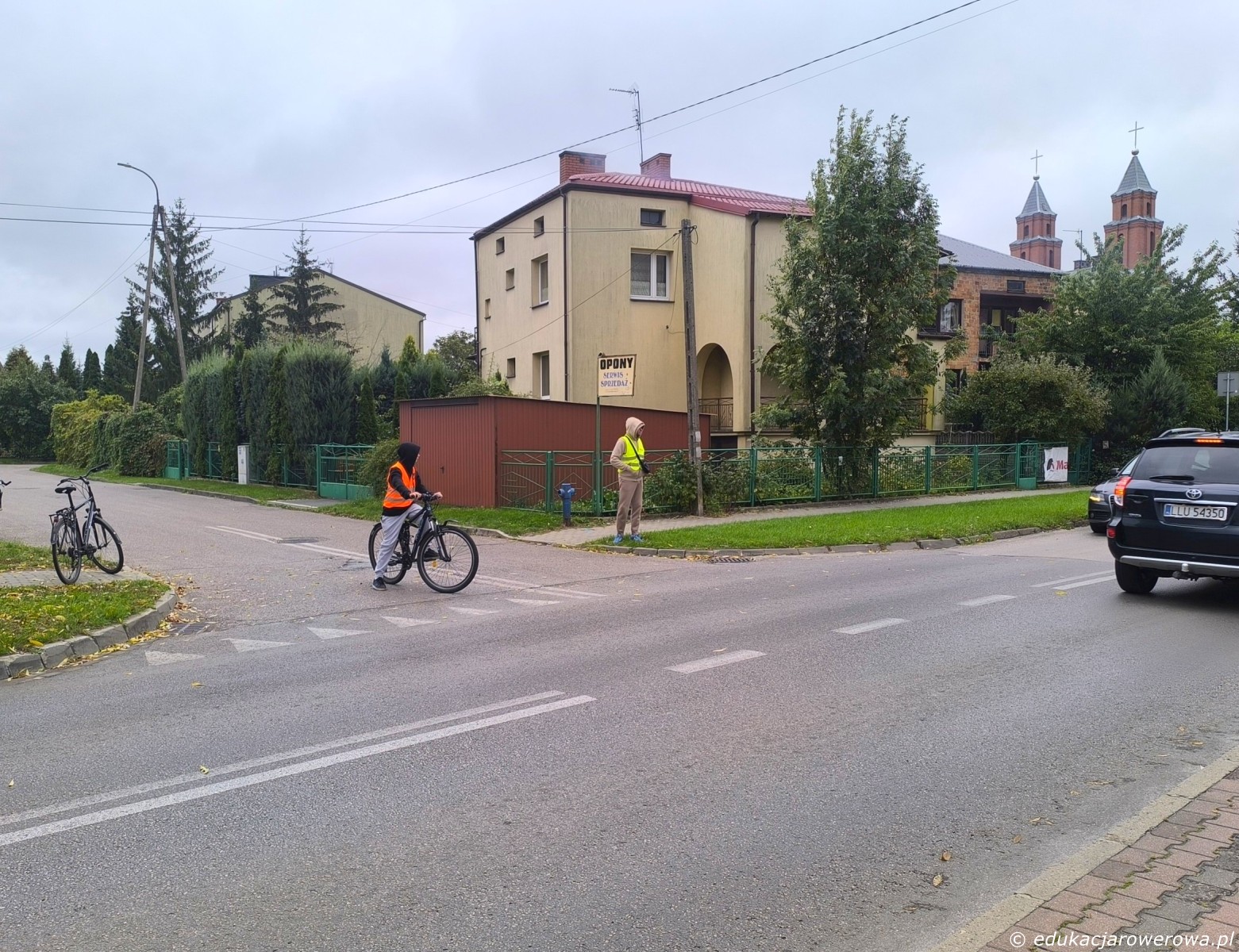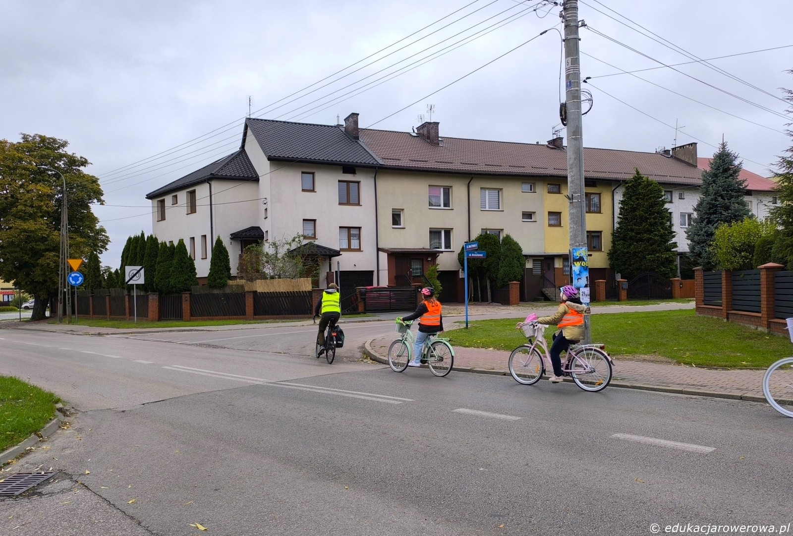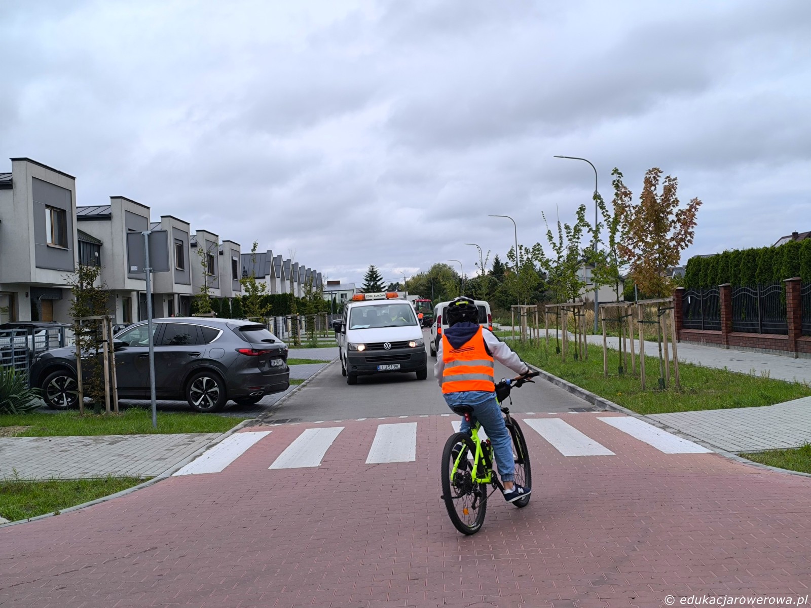 I jeszcze jedna część osiedla – najpierw grupą objeżdżamy kwartał, a potem każdy po 2-3 razy zrobił ćwiczenie samodzielnie. W oddali pierwszy lewoskręt z drogi z pierwszeństwem, a także pies, któremu spodobało się gonienie rowerzysty…