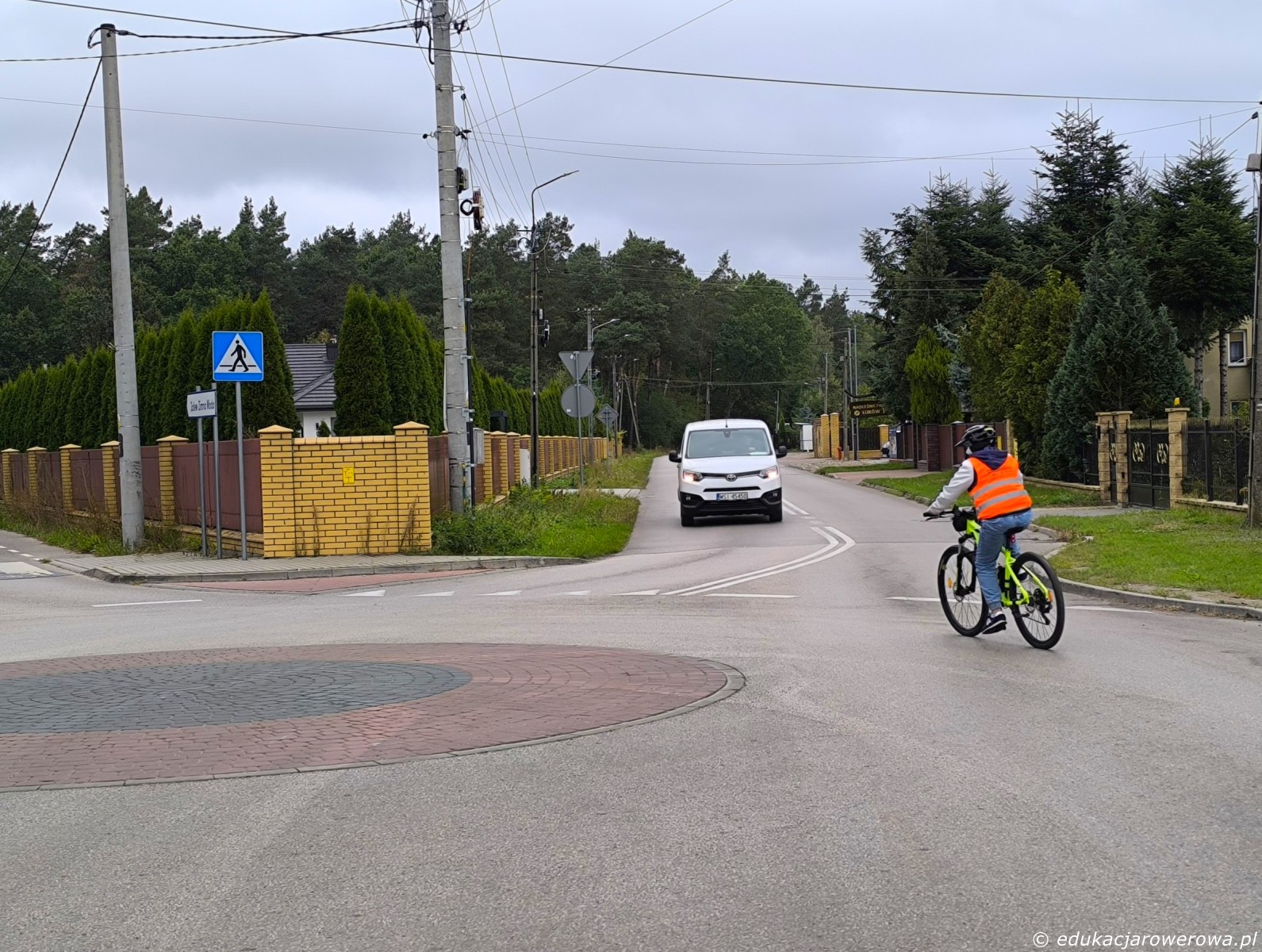 Końcówka manewru skrętu w lewo. W Łukowie bardzo wiele skrzyżowań na strefach osiedlowych ma wyniesione tarcze skrzyżowań, więc i jazda rowerem jest tam bardzo bezpieczna.