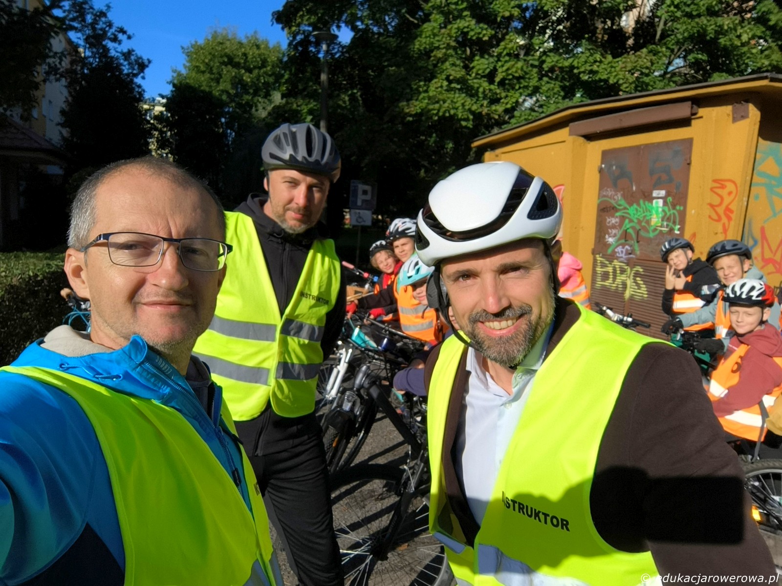 Dzisiejsze – 18 września 2025 roku – zajęcia praktyczne w ruchu drogowym w Szkole Podstawowej nr 9 w Białej Podlaskiej to nie tylko dwie mocne grupy uczniów i uczennic (łącznie 30 os.), ale także spotkanie z Prezydentem Michałem Litwiniukiem, który od lat rozkręca Rowerową Stolicę Polski Biała Podlaska. Na trasie kolejny już rok był z nami pan Robert Woźniak, nauczyciel i jednocześnie przewodniczący Rady Miasta, a stacjonarnie pani wicedyrektor Violetta Kołodziejczuk i pan Stanisław Romanowski – Naczelnik Wydziału Edukacji i Spraw Społecznych. Miasto Biała Podlaska żyje rowerami i cieszymy się, że możemy wspierać je na polu nowoczesnej edukacji rowerowej.