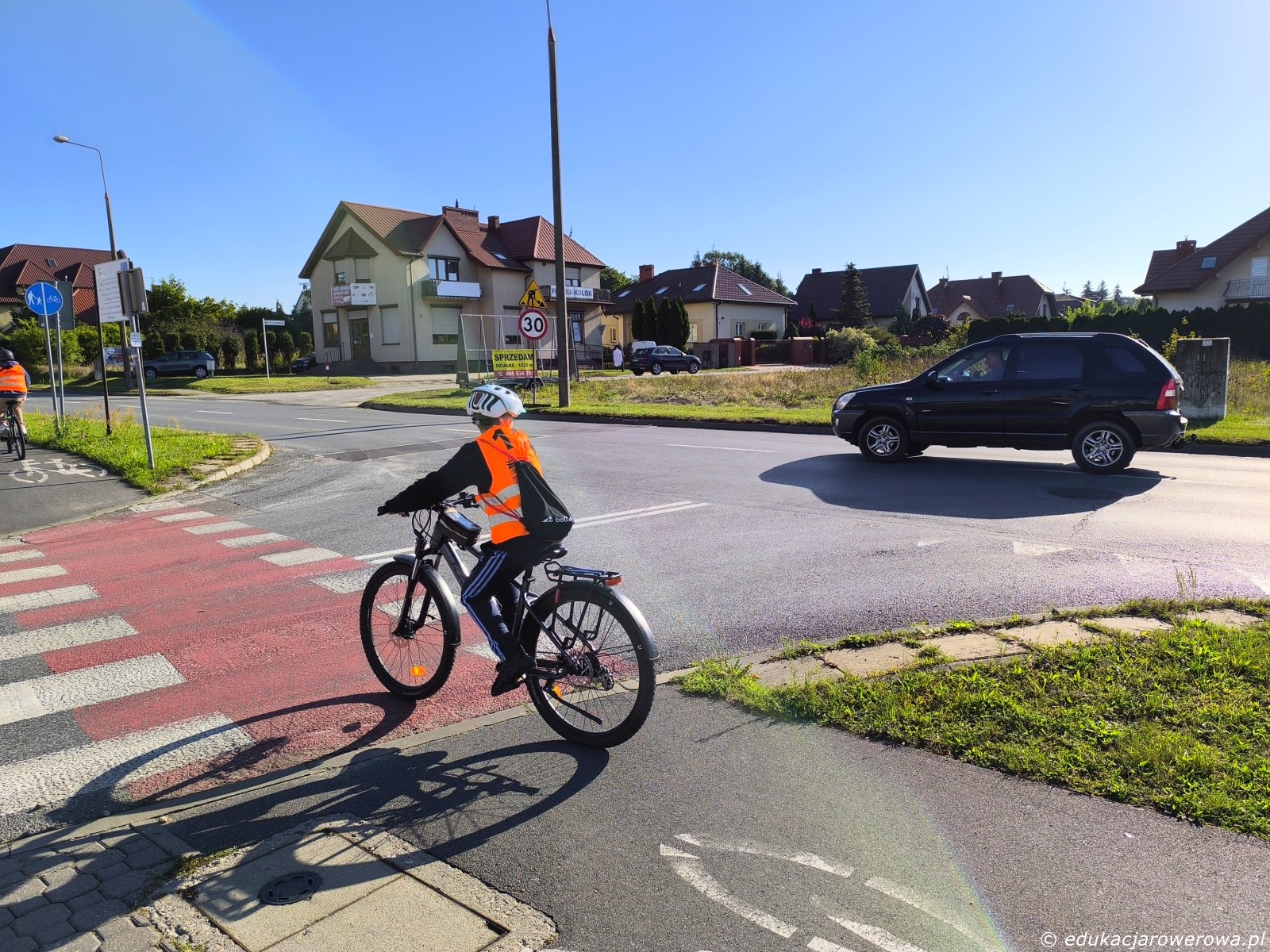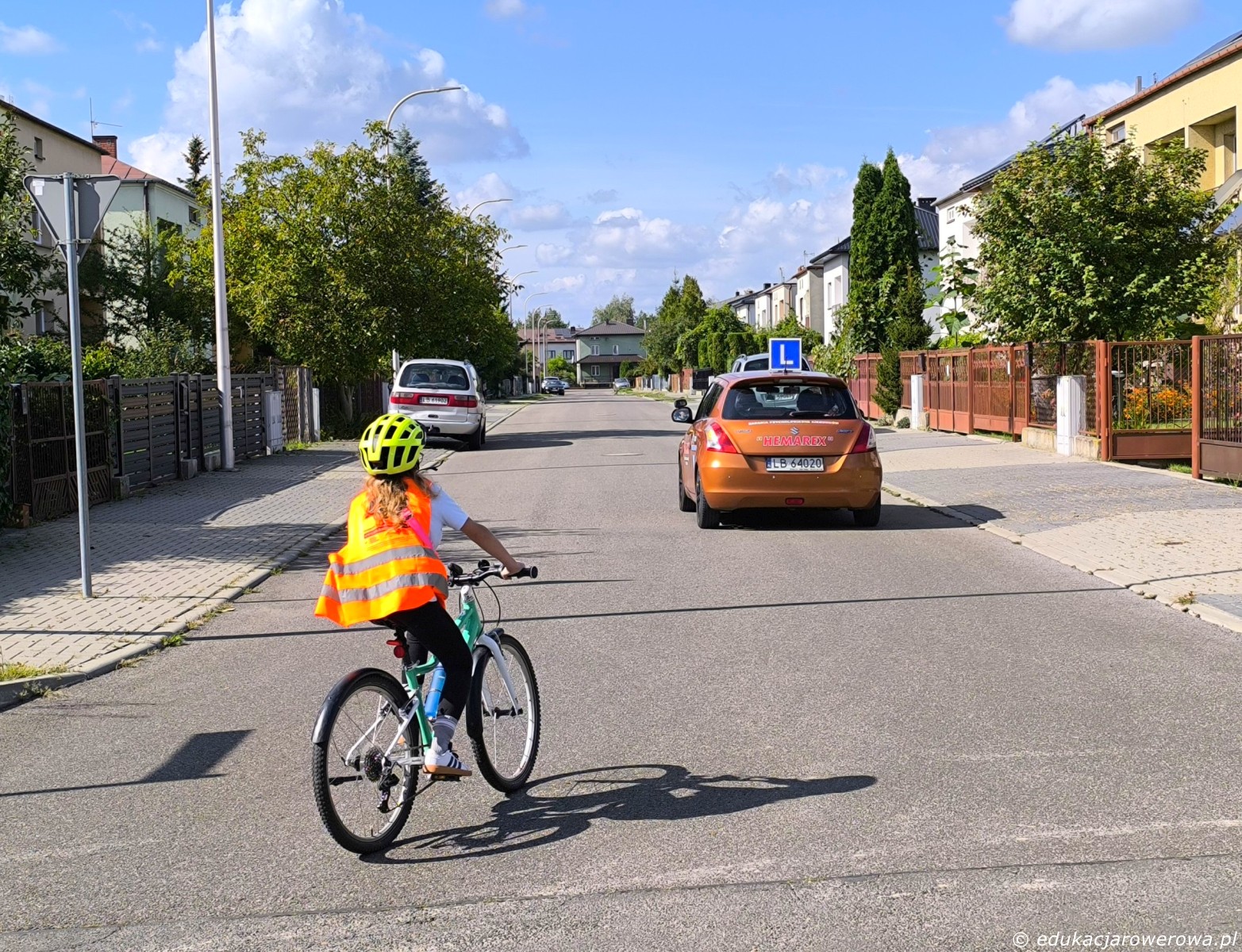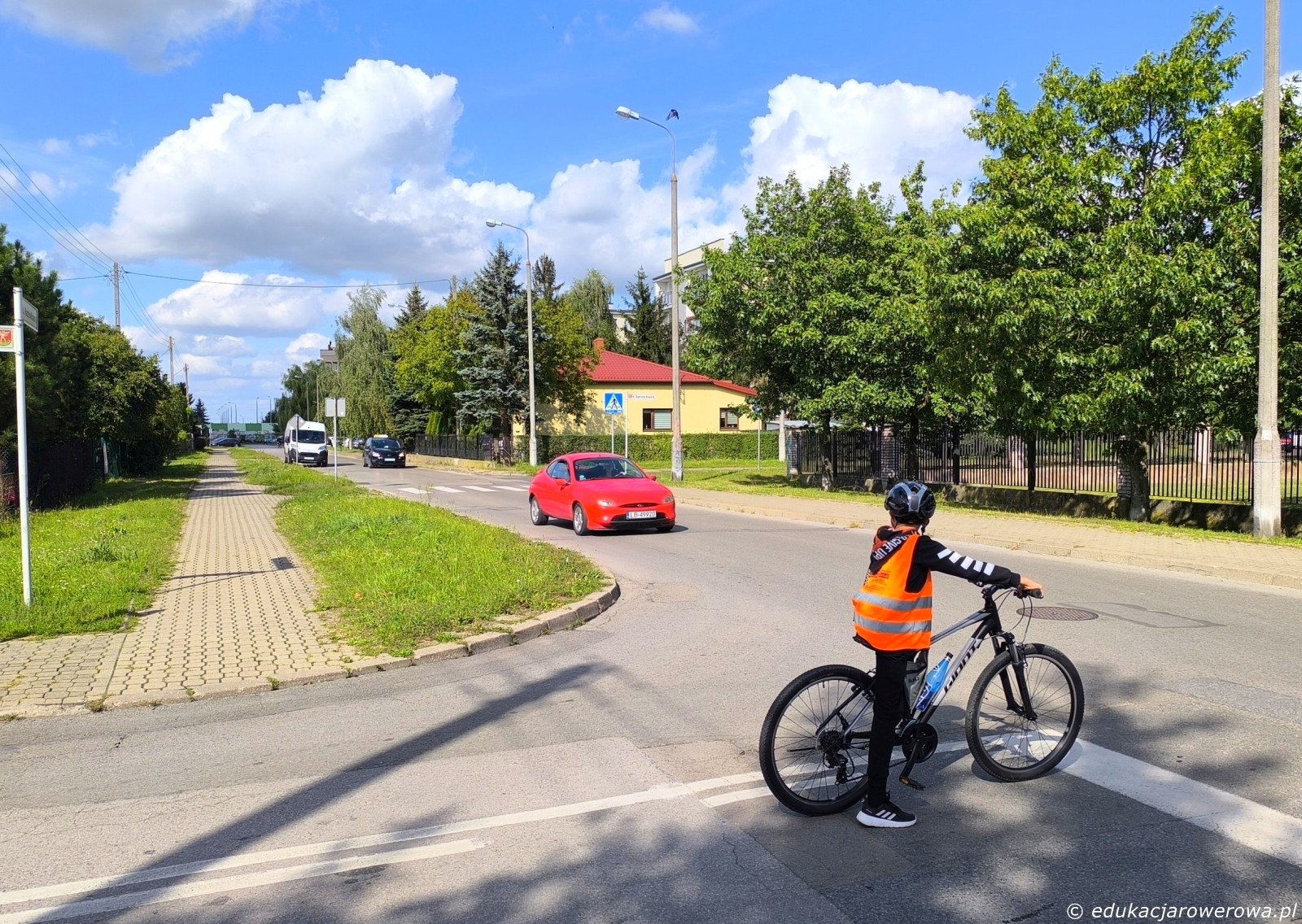 Tu uczeń wjeżdża na przejazd dla rowerów i jednocześnie obserwuje pojazd po prawej stronie kontrolując sytuację i oceniając, czy dalsza jazda będzie dla niego bezpieczna.