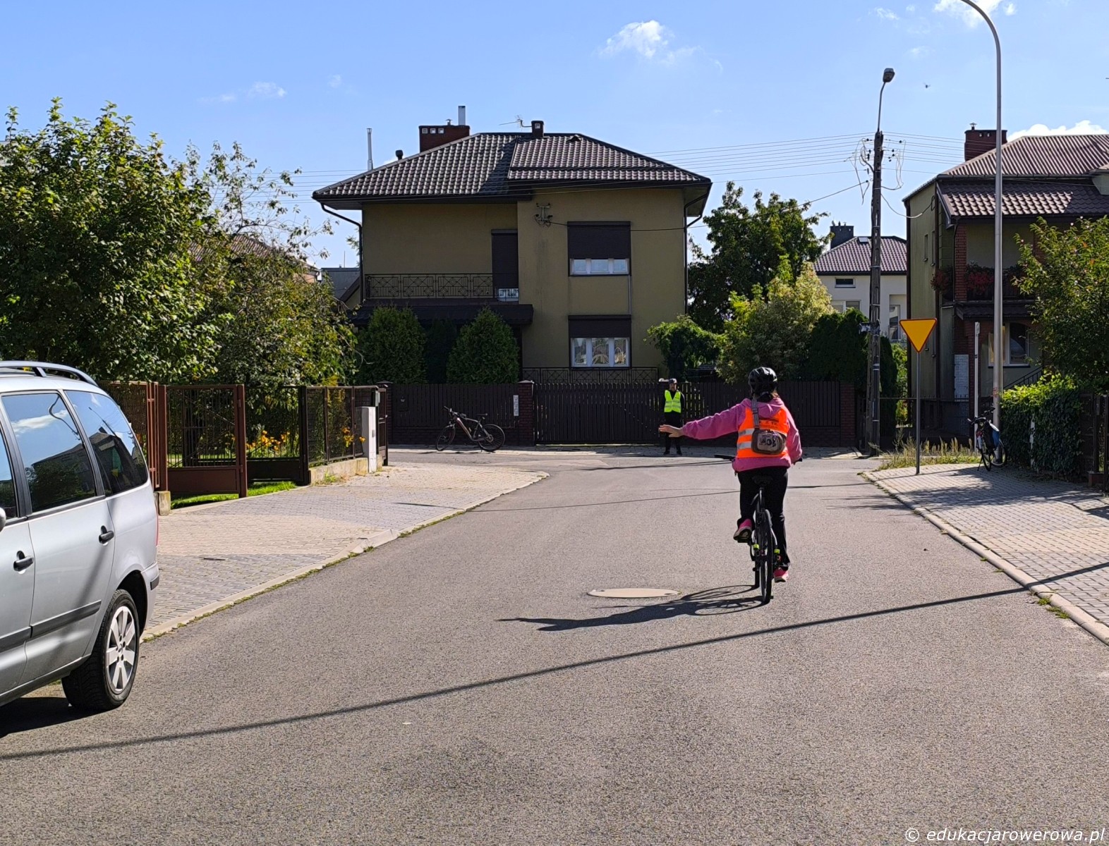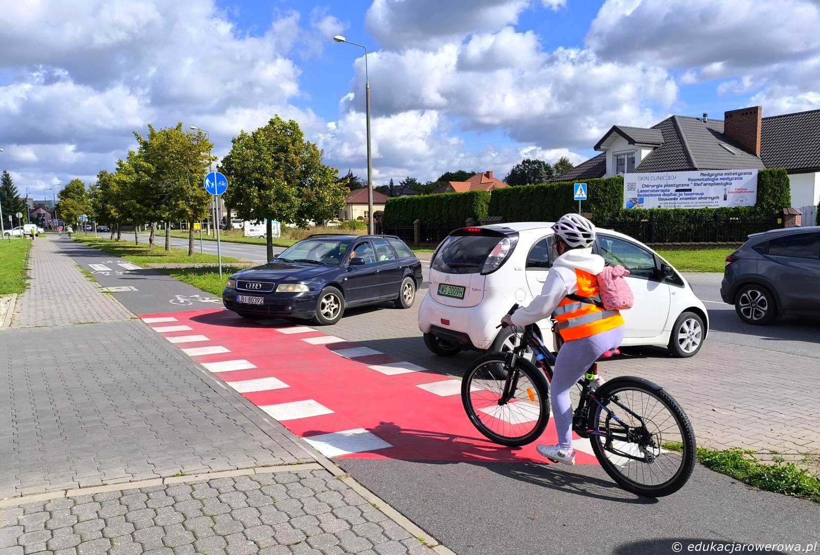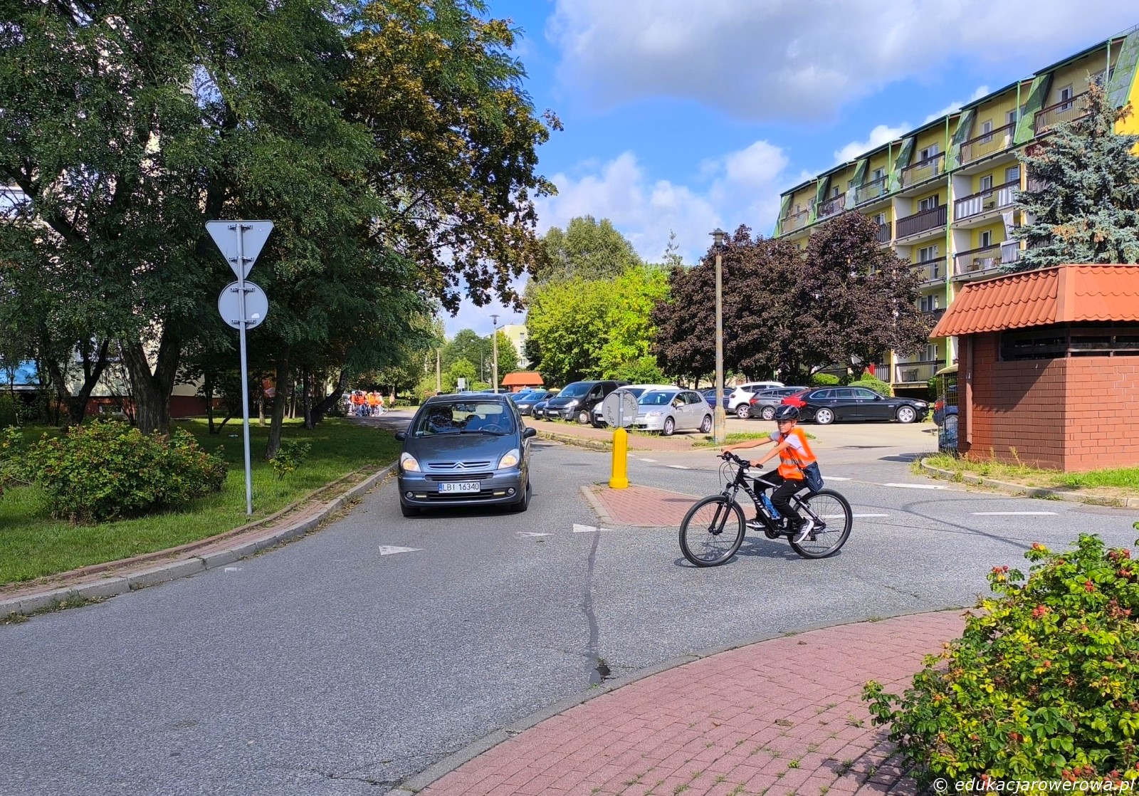 Tu uczeń wjeżdża na przejazd dla rowerów i jednocześnie obserwuje pojazd po prawej stronie kontrolując sytuację i oceniając, czy dalsza jazda będzie dla niego bezpieczna.
