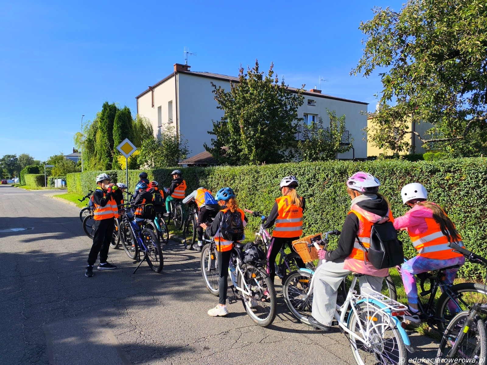 Przejechaliśmy ulicę dalej i zatrzymaliśmy się na drodze dla rowerów, by omówić zasady ćwiczenia na przejazdach dla rowerów. Uczniowie mieli do pokonania 3 przejazdy w jedną stronę i te same na powrocie – razem 6 przejazdów na których ćwiczyli umiejętność obserwacji drogi i oceny czy nadjeżdżające samochody mogą stwarzać zagrożenie.